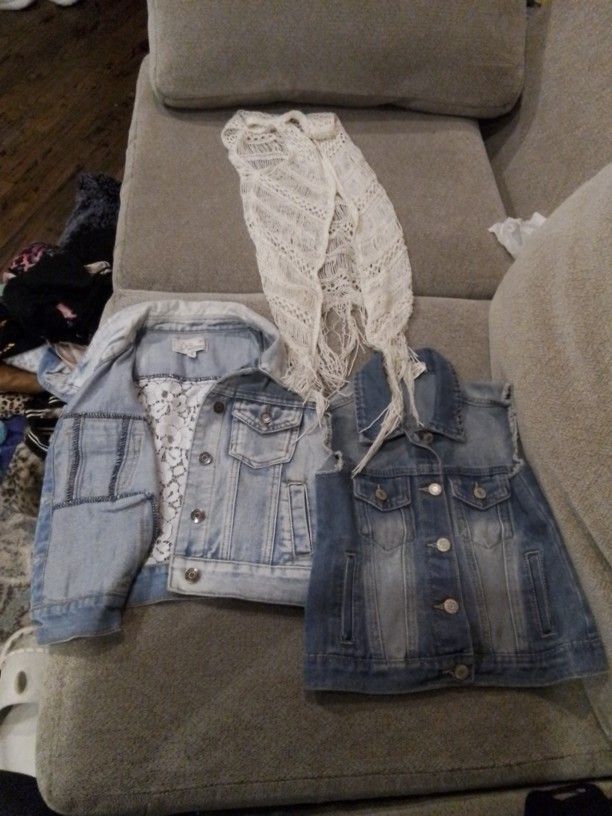 Buttoned Jean vest, Buttoned Jean vest with rear white lace, loose knited ivory vest, Med youth size lightly used great condition. Jean vests $10 each knitted $5 all for $20