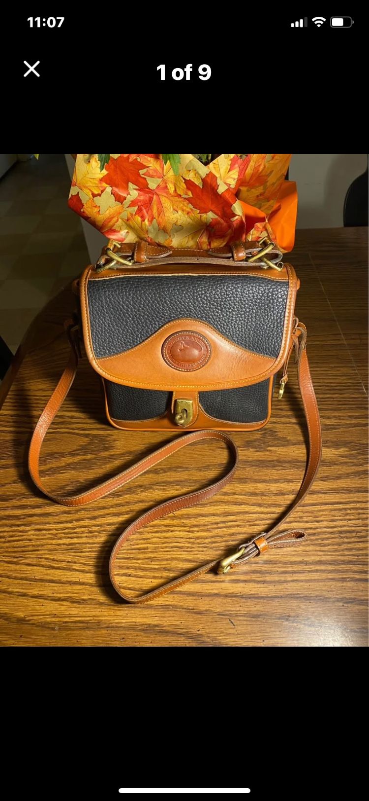 Dooney & Bourke All-Weather Leather Square Carrier Crossbody Bag. This style is a classic design from the 1980s and 1990s and is known for its durable, pebbled cowhide leather that is resistant to water. The bag features a turn-lock closure, a top handle, and a removable, adjustable crossbody strap. It was made in various colors, with the black and British tan combination being a popular option. Cash payment only thanks
