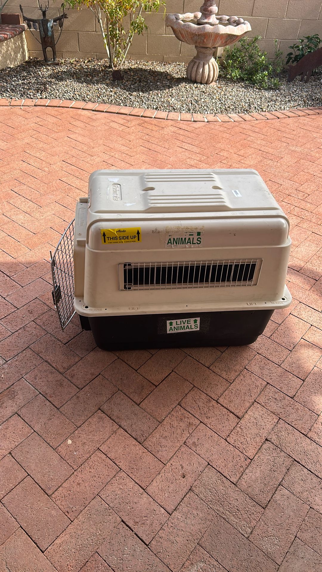 Shipping crate for medium sized dog. It is fairly lightweight and includes door and all fasteners. This crate is 31” long X 22” wide X 25” interior height.