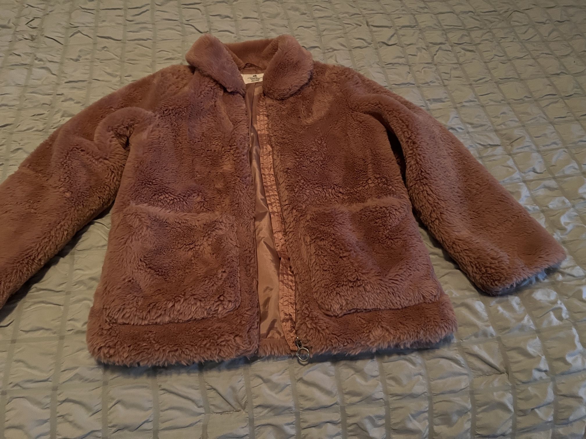 Cozy pink super soft, H&M faux fur jacket with pockets and zipper. Kids size medium. Washable. Still love it, but too small now.