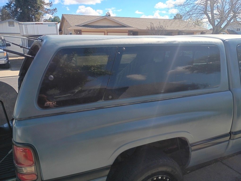 LEER fiberglass camper shell for a 2nd‑gen Dodge Ram long bed (8ft). Hard to find in this size. Details: - Fits 1994–2001 Ram 1500/2500 long bed - Tinted windows - Carpeted interior - Side back windows opens - Back window opens acuators still good - Rear latch + hardware included - I have the keys for the lock Condition: Solid overall. One chipped spot on the lower rear edge (fiberglass). Doesn’t affect mounting. Price: $800 OBO
