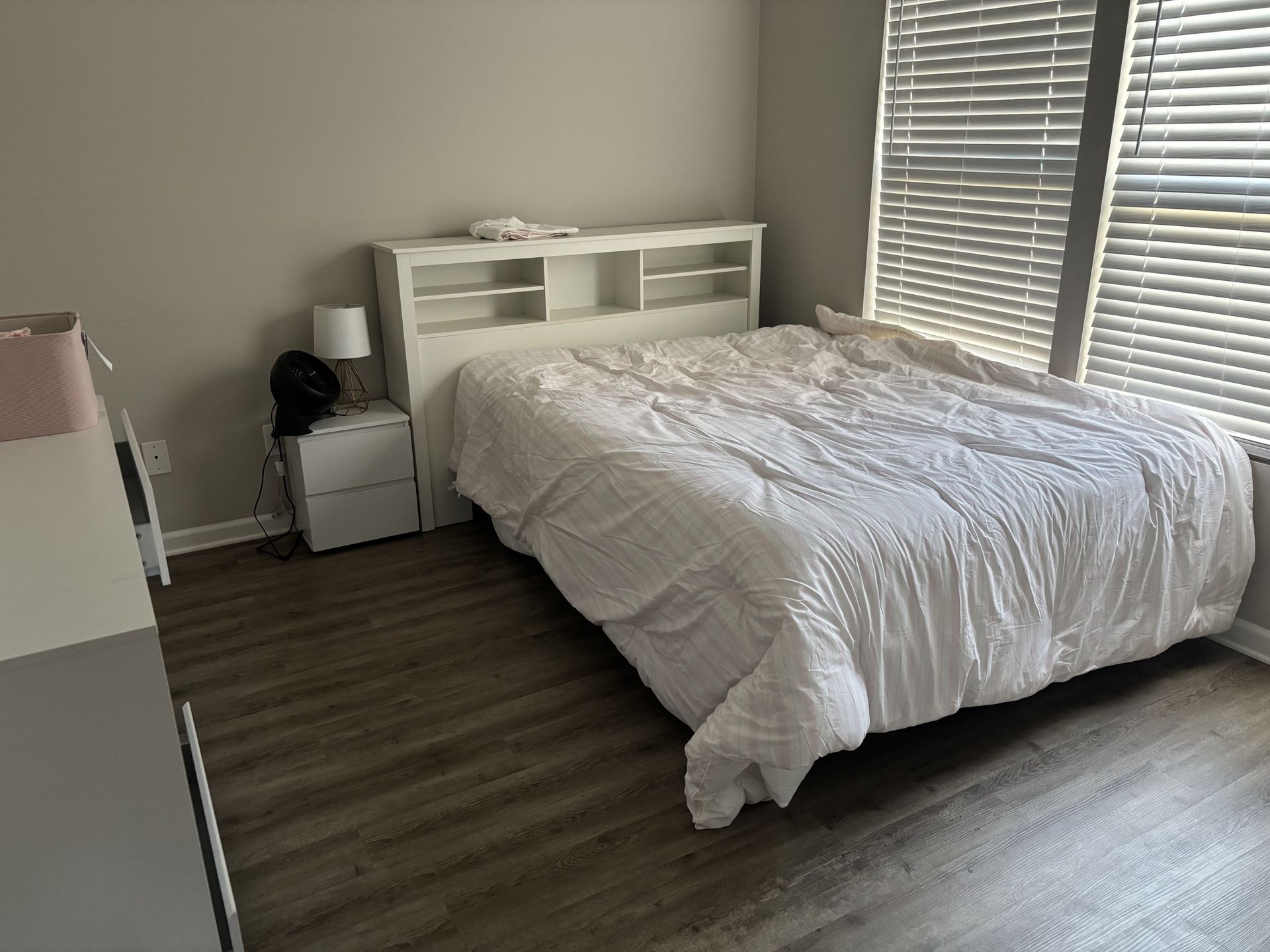 White dresser has water stain picture above but can be easily repainted. Queen memory foam mattress with light staining but has been steam cleaned. Brand new TJ maxx comforter never used. Nightstand, headboard with bookshelf slots, and lamp