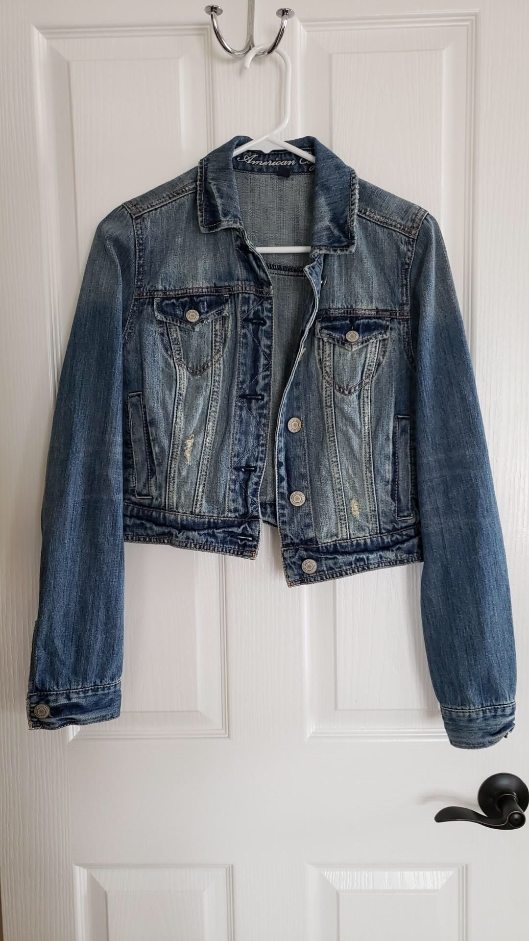 American Eagle cropped denim jacket. Button closure. Distressed.