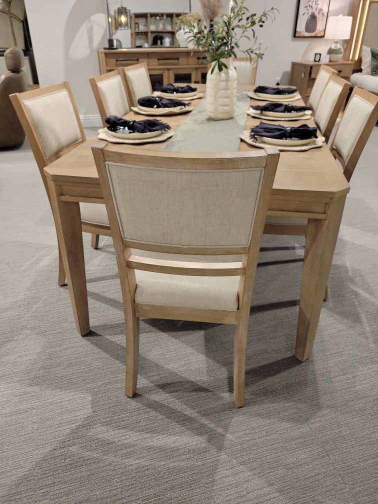 Crafted from hardwood solids with rich oak veneers, this rectangular table showcases a warm Mocha Medium Brown finish that brings natural beauty to any space. The canted leg design adds a touch of modern character, creating a dynamic silhouette that catches the eye from every angle. Sturdy and stylish, it’s a versatile centerpiece for everyday dining or special gatherings. Buffet server dimensions: 64 L x 18D x 37 H $1169.00 Side chairs (set of 2) $399.00 Dining Table dimensions: $729.00 Width 78 - 96 in. Depth 42 in. Height 30 in. ** EVERYONE QUALIFIES** ** NO CREDIT NEED IT** ** 90 DAY PURCHASE OPTION** **SHOP NOW, PAY LATER, ALL WITHOUT CREDIT TEXT 5581 TO 22462 TO APPLY. Monday to friday 9:00 am to 8:00 pm Saturday 9:00 am to 7:00 pm. Sunday 9:00 am to 6:00 pm. **INVENTORY CHANGES DAILY MESSAGE FOR MORE DETAILS. PLEASE CHECK MY OFFERS I HAVE MORE QUALITY FURNITURE! Sofa, chaise, couch, fabrics, comfortable, sectional, chair, living room, family room, coffee table, End Table, TV stand, Credenza, cabinet, mirror, accent chair, Art Pictures, decorations, lamps, Dining Table, Dining Chair, Wood, Modern, Sofa, Chair, dinette, Patio Furniture, Stool, Chaise Lounge, Standing Desk, Murphy Bed, TV Stand, Accent Chair, Bar Stool, Bunk Bed, Daybed, Coffee Table, Credenza, Buffet, China Hutch, kitchen, Bar Cabinet, Console Table, Sideboard, Folding Table, Accent Table, office, decor, rug, plant, home, house, server, flower, mirror, marble, fireplace, velvet, art, picture, wall, paint, counter, ottoman, bookshelf, desk, file, base, bench, chest, dresser, headboard, mattress, memory, foam, spring, armoire, curio, lamp, light, led.