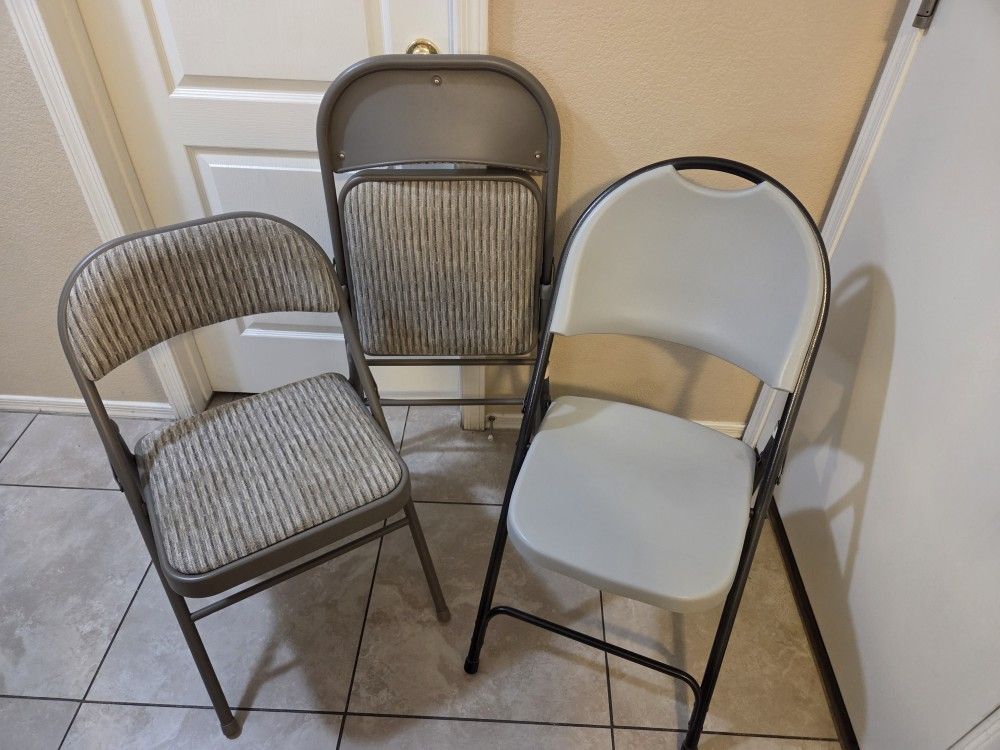 3 folding chairs, used condition. Willing to sell separately. Pet free/ smoke free home. Cash only.