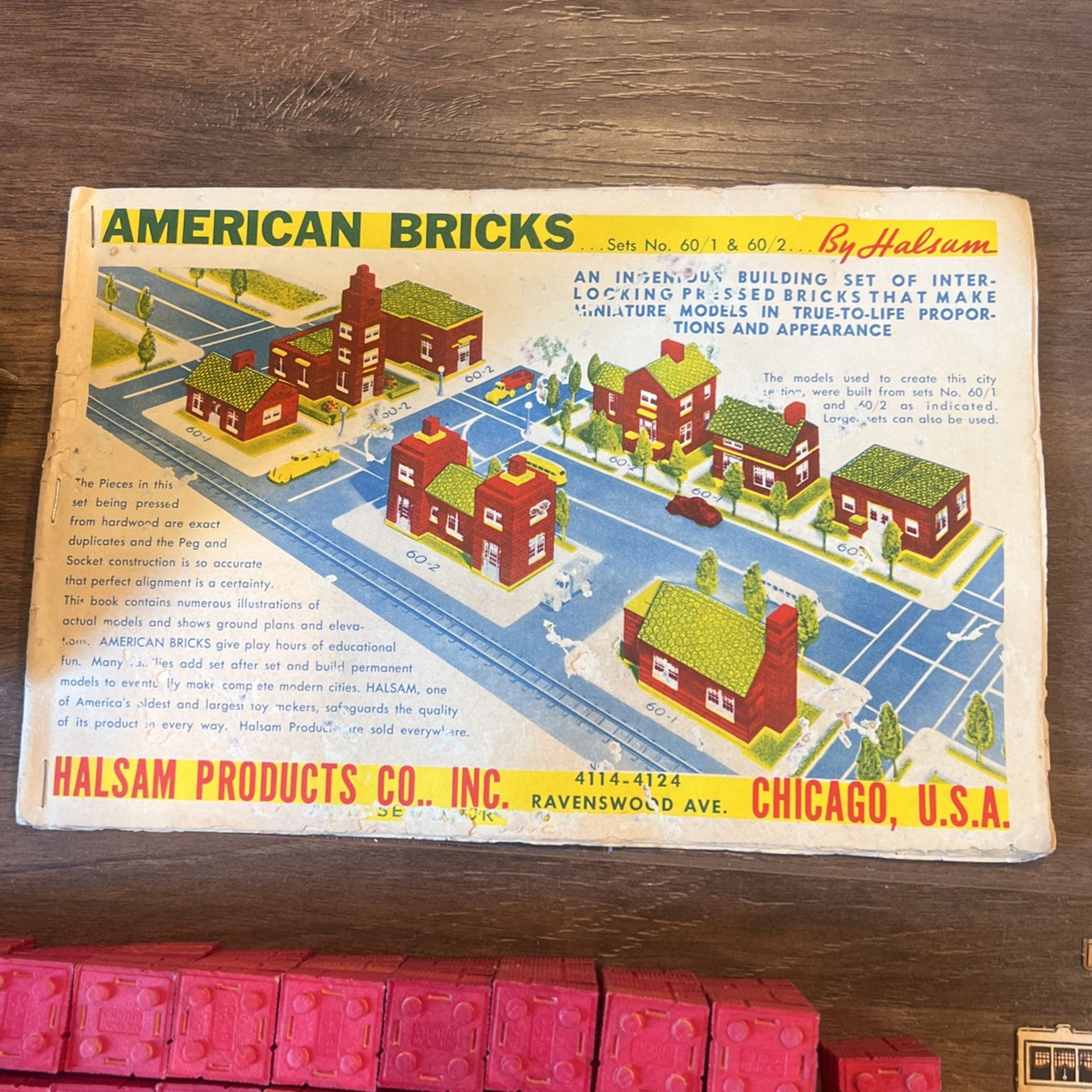 American Bricks by Halsam. Vintage 1940 blocks. 981 blocks 5 cardboard roofs 60 windows and doors with a complete instruction book.The original Legos.