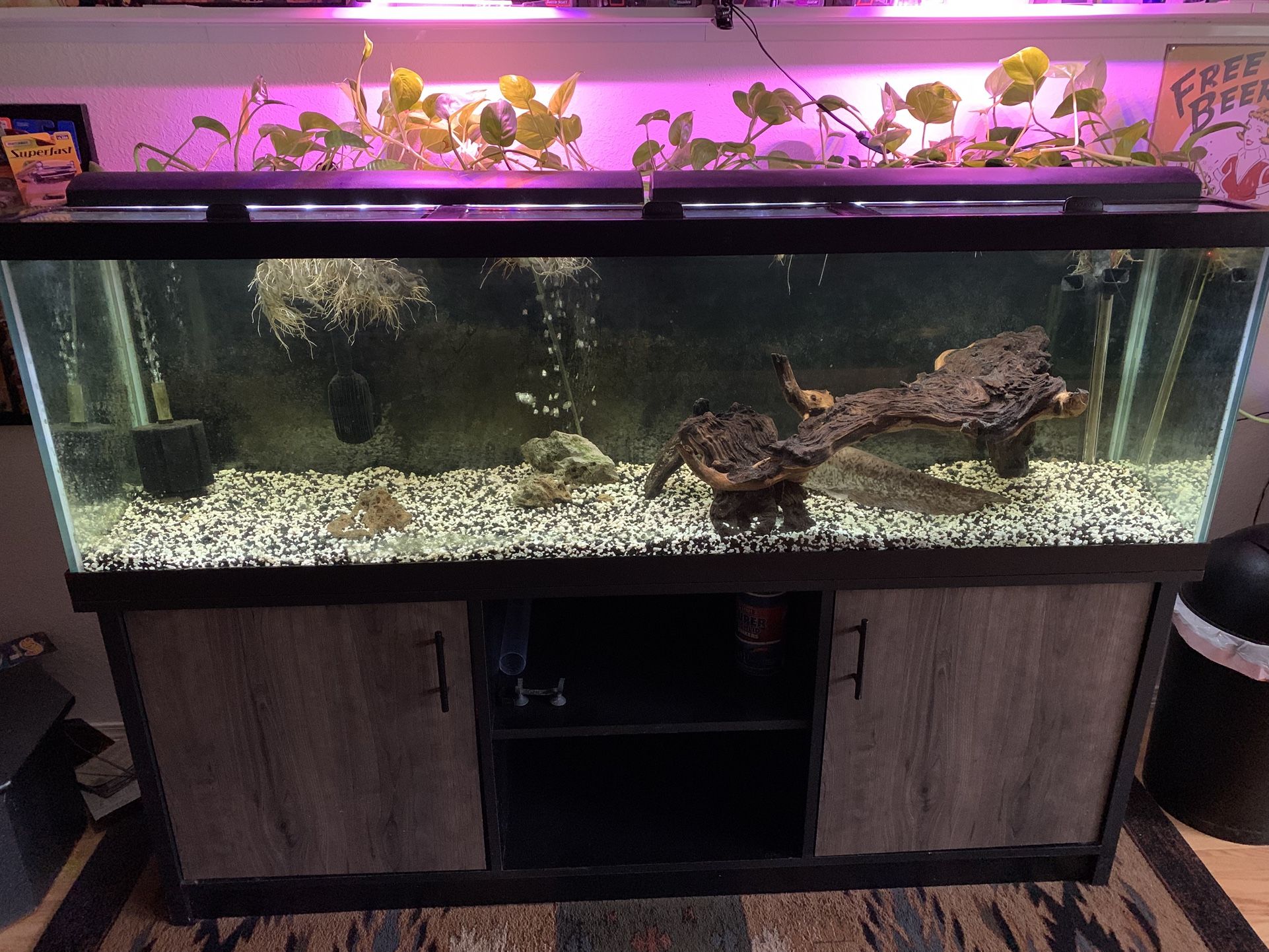 Newer 125 gallon aquarium for sale. Tank, stand, lids and led lights, and an FX6 filter. Fish and wood logs not included. 72x18x23