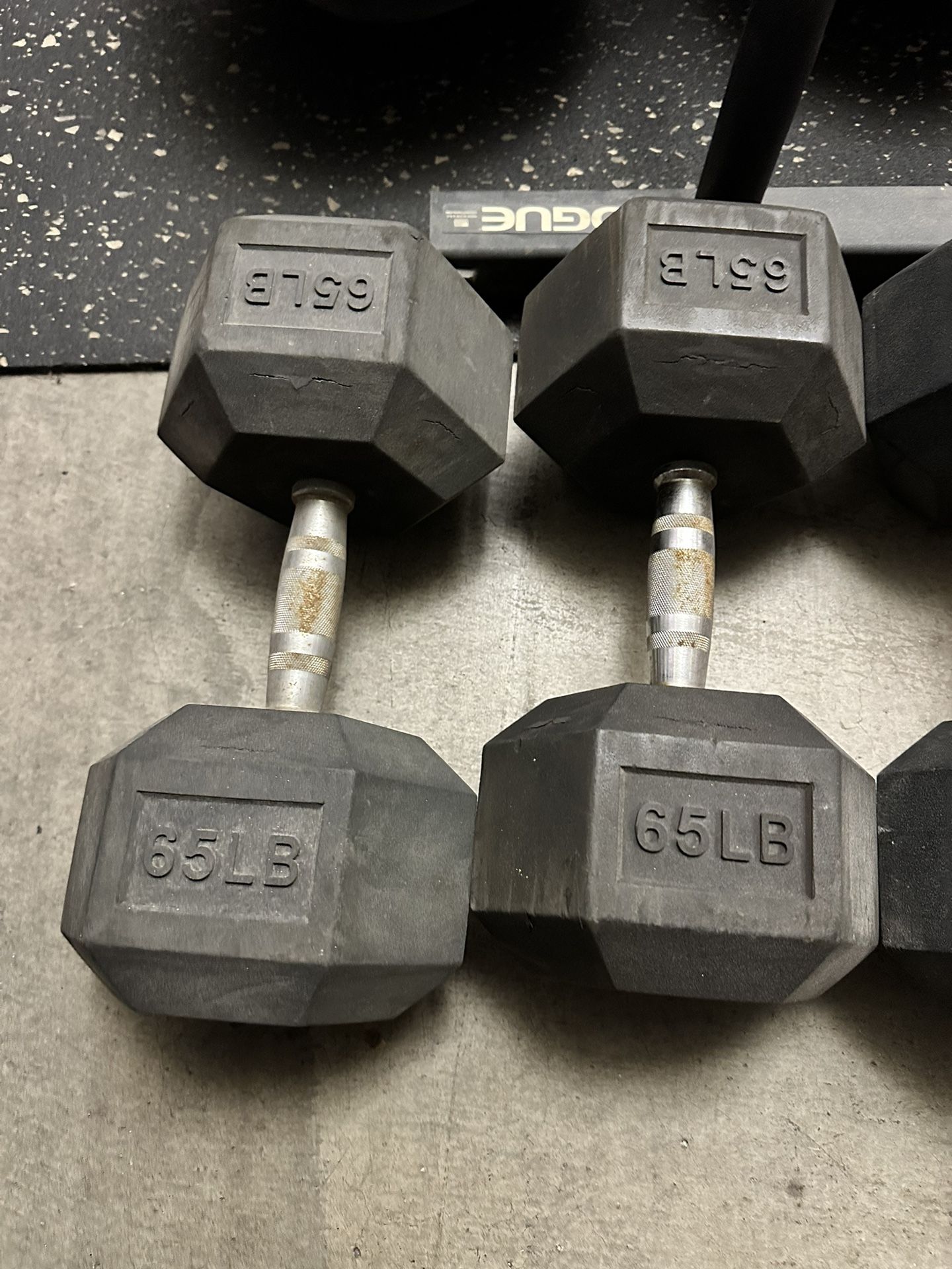 Selling pair, no rips on rubber. $1 per pound rate. Check other dumbbells 75,85 available and kettlebells, push sled, parallete bars, concept 2 rower, wall balls