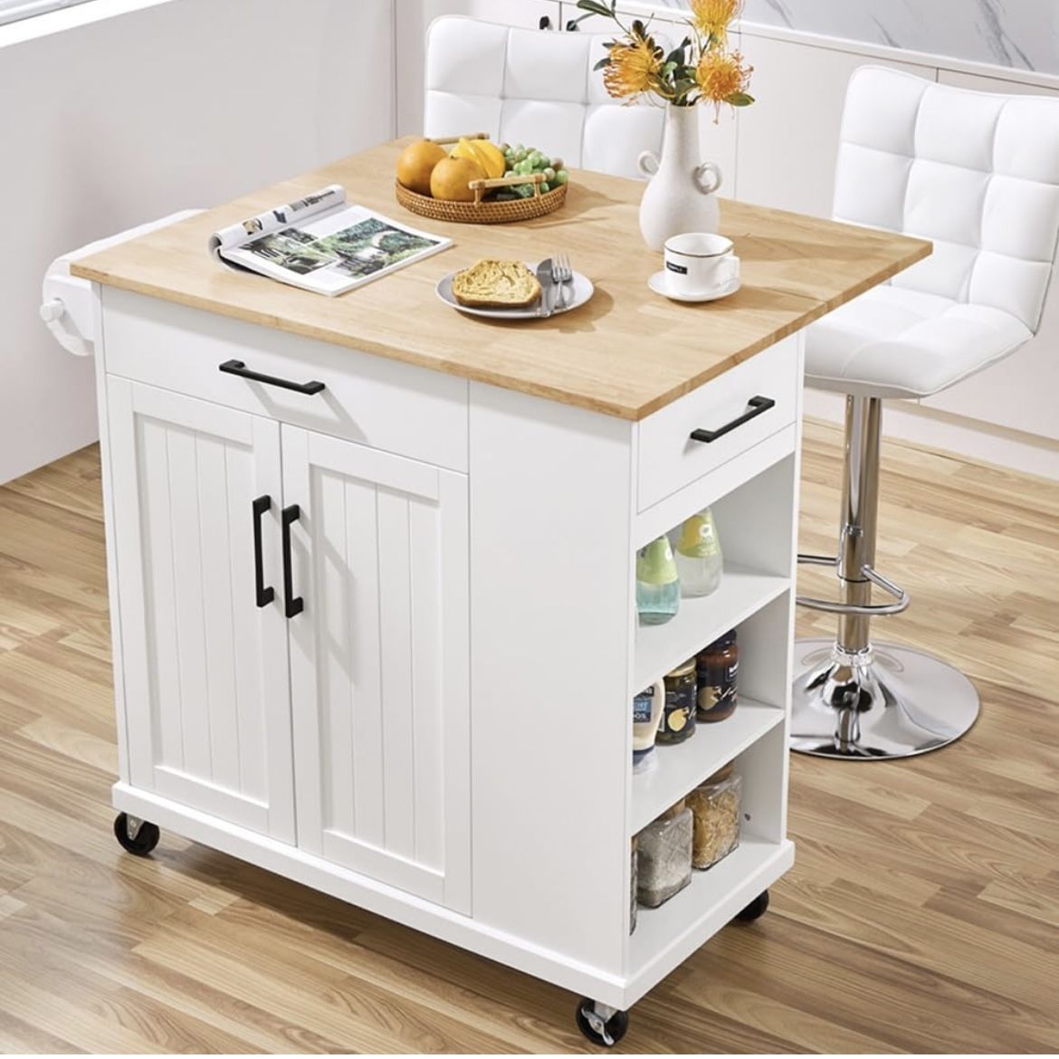 Rolling Kitchen Island Cart with Drop Leaf, Portable Rubberwood Breakfast Bar with Storage Cabinet, Open Shelves & Detachable Towel, 2 Drawers, White