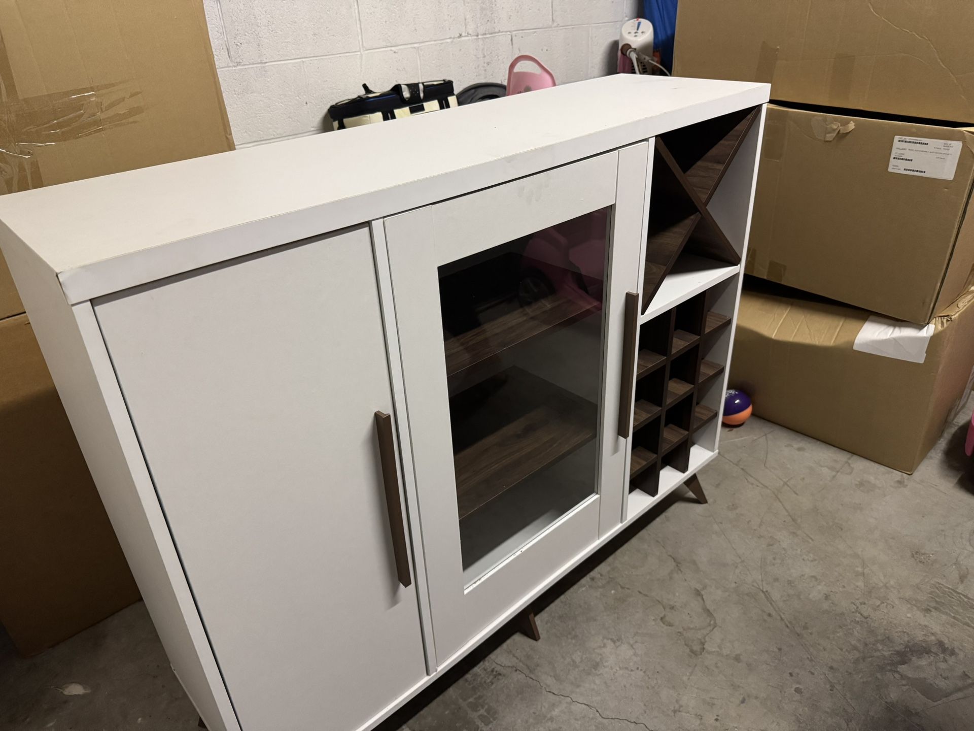 Modern style bar cabinet in good condition. Corner small damage but nothing major .