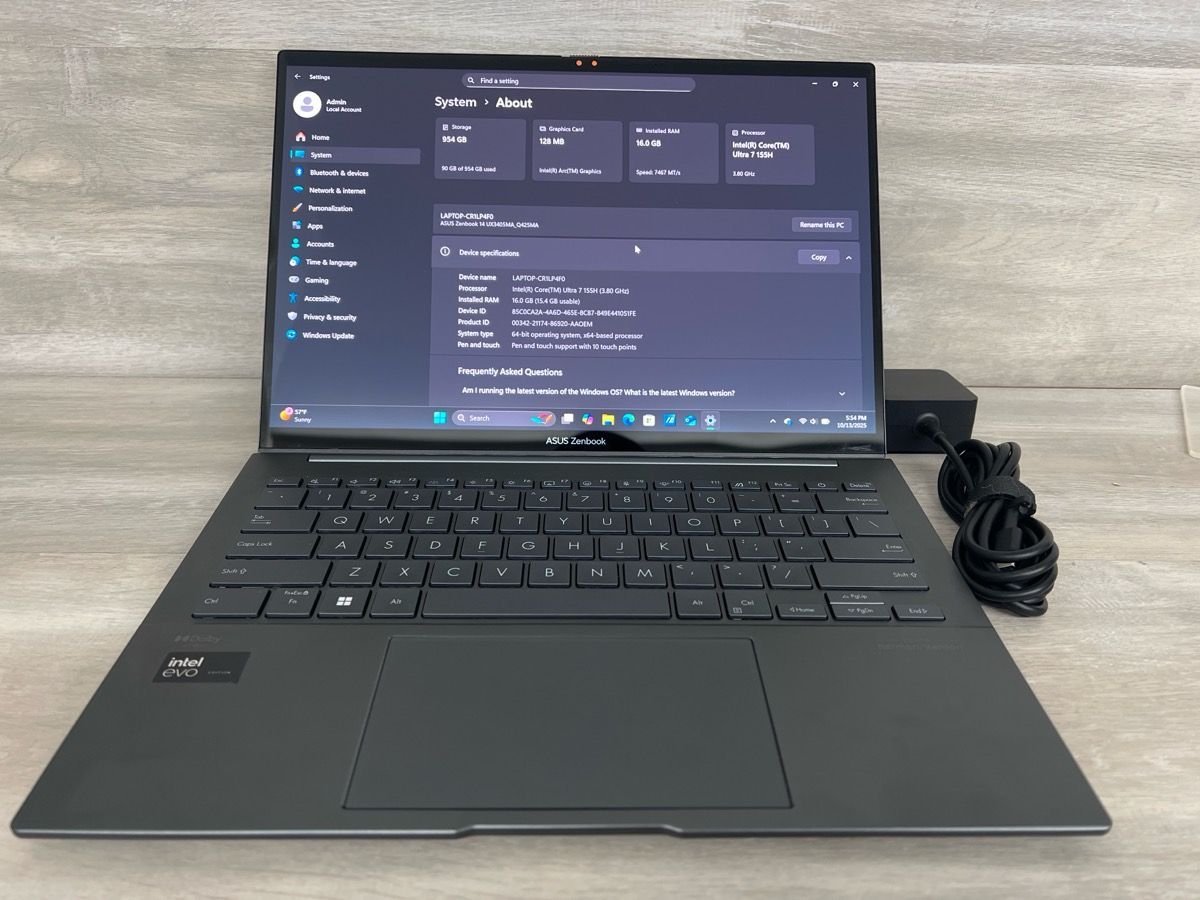 The ASUS Zenbook Q425M (model UX3405MA, 2024 release) features the Intel Ultra 7 155H processor with 16 cores, integrated AI Boost, and Intel Arc graphics for fast and efficient performance. It includes 16 GB LPDDR5x RAM and a 1 TB PCIe 4.0 SSD — double the capacity of most retail units. The larger SSD adds strong value, as upgrading this model requires a full internal teardown with shield and bolt removal — not a simple plug-and-play install. The 14" OLED touchscreen offers deep contrast and vivid color, while Wi-Fi 6E AX211 and Bluetooth 5.3 deliver modern connectivity. Lightweight aluminum body under 3 lb with a balanced one-finger hinge that opens smoothly and holds firm. Excellent condition, fully tested, includes charger.