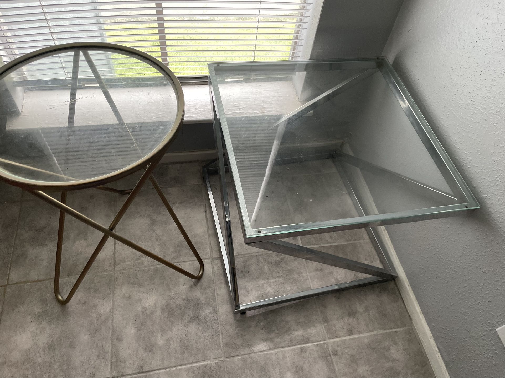 One glass coffee table (no suctions cups to stop the glass from moving)) one gold end table One square glass end table