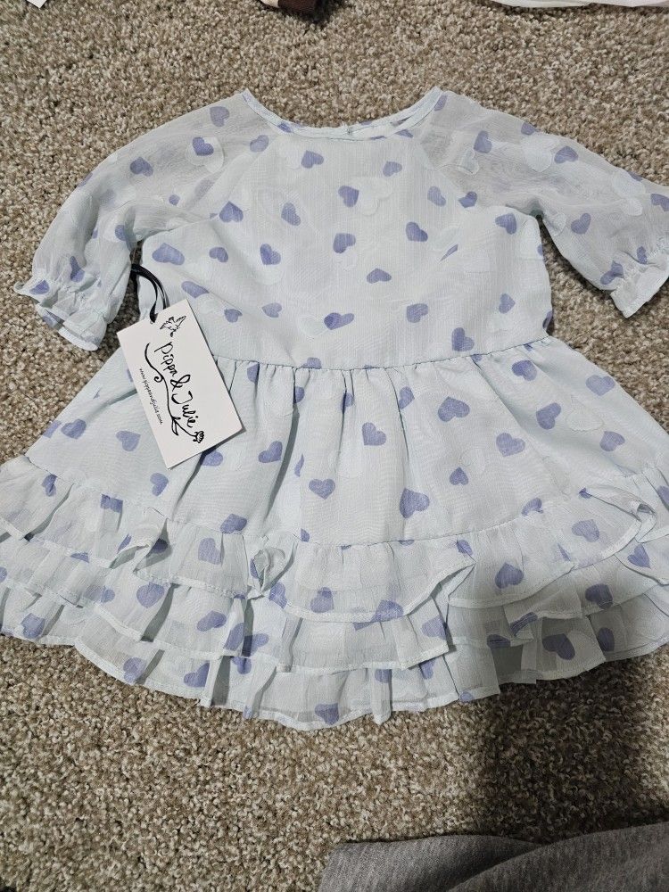 Unisex sleepwear, size 4, for 5.50. Pink jacket for girls, size 24 months, for 6.50. Blue dress with matching bloomers, size 12 months, for 7.50.