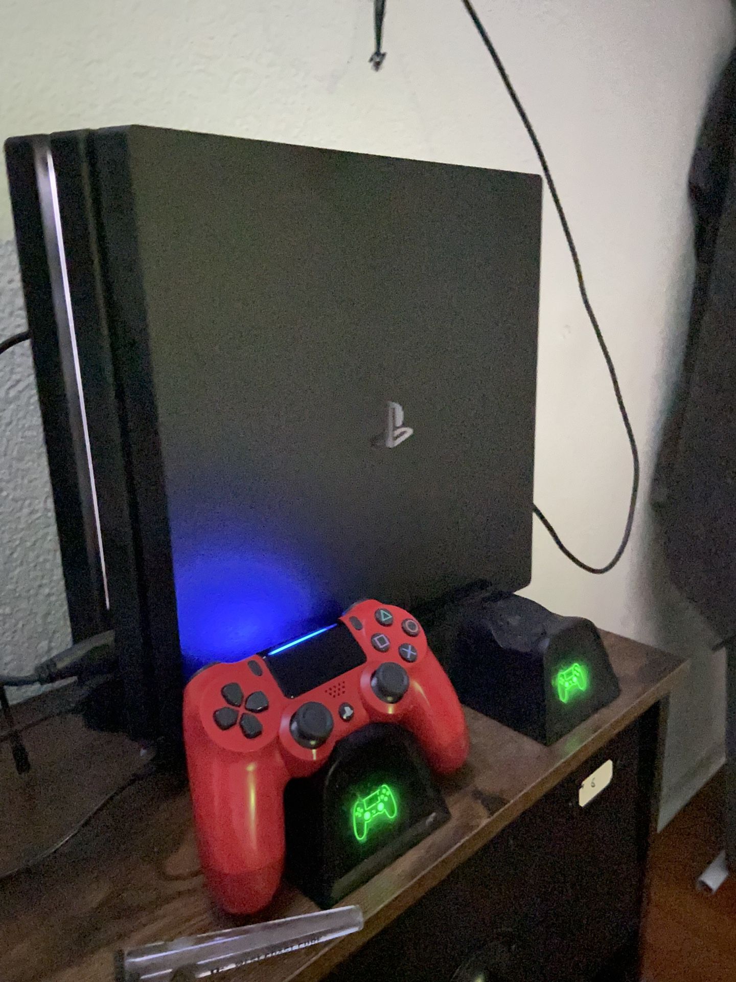 PS4 (good condition) 1 red controller with cable AC/DC cord HDMi cord *Control charger port Stand with fan * *Included* *****PS4 pro en buenas condiciones con juegos y control accesorio de estación para controles y ventilador para consola ******