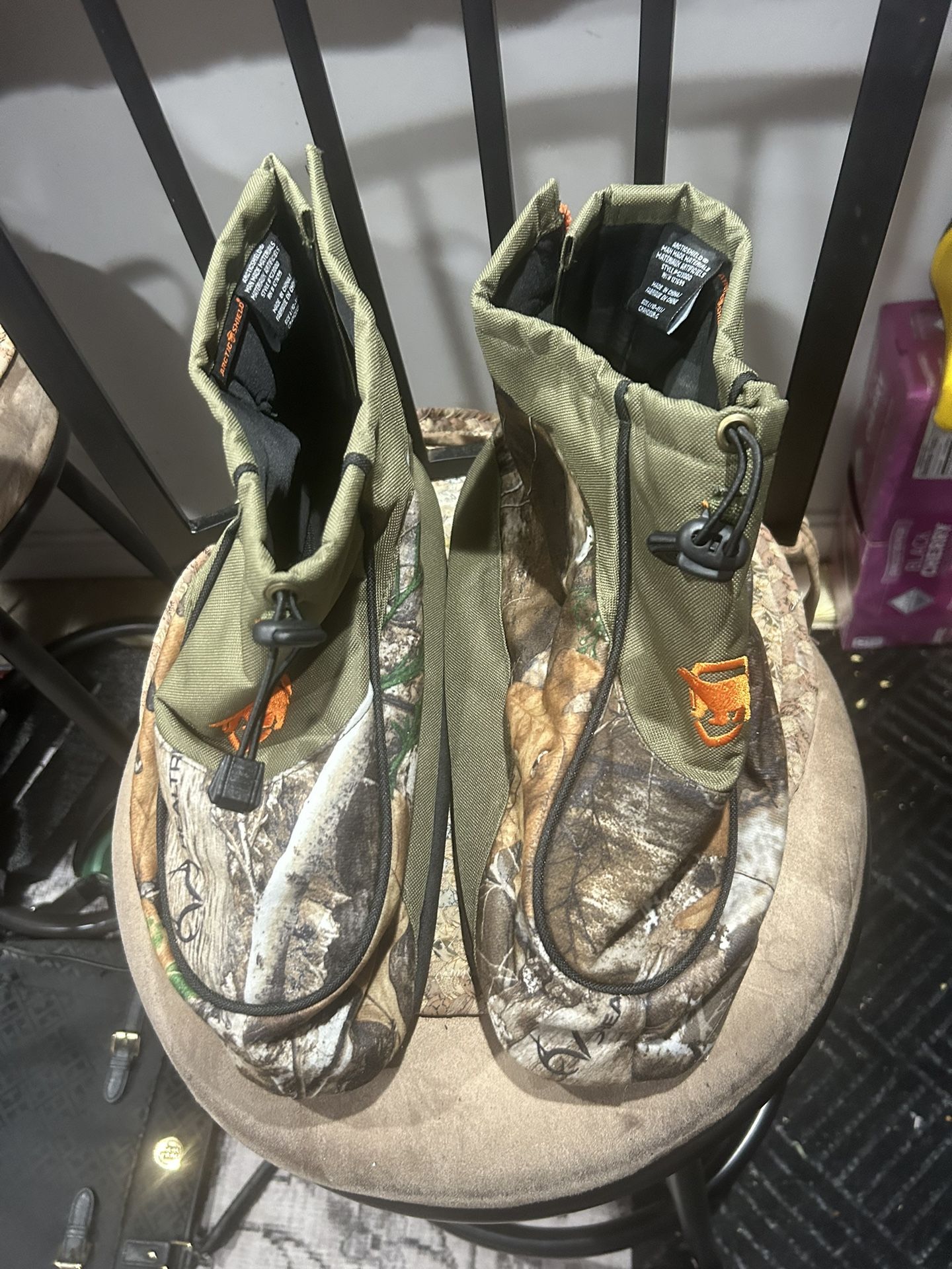 Men's size large (10.5 to 11.5) Boot cover insulators RealTree Artic Shield Camouflaged with forest green Zip up in back for easy slip on Pull tag in front for weather resistance Waterproof and insulated Please check last picture for more complete information
