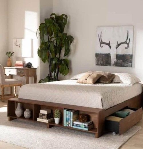 Find a convenient solution to your bedroom storage needs with the bed. A wood bench fitted with three shelves lines the front of the frame, perfect for showcasing books or decorations. The bed and includes four underside drawers to make this piece especially helpful in rooms with limited space. Assembly is required and a box spring isn't necessary, as the bed comes with internal slats for mattress support. The clean design of the bed is complemented by ash walnut brown finished wood, giving your space a modern, comfortable appeal.Platform Height (in.) 12.4 in Product Depth (in.) 89.84 in Product Height (in.) 45 in Product Width (in.) 80.71 in