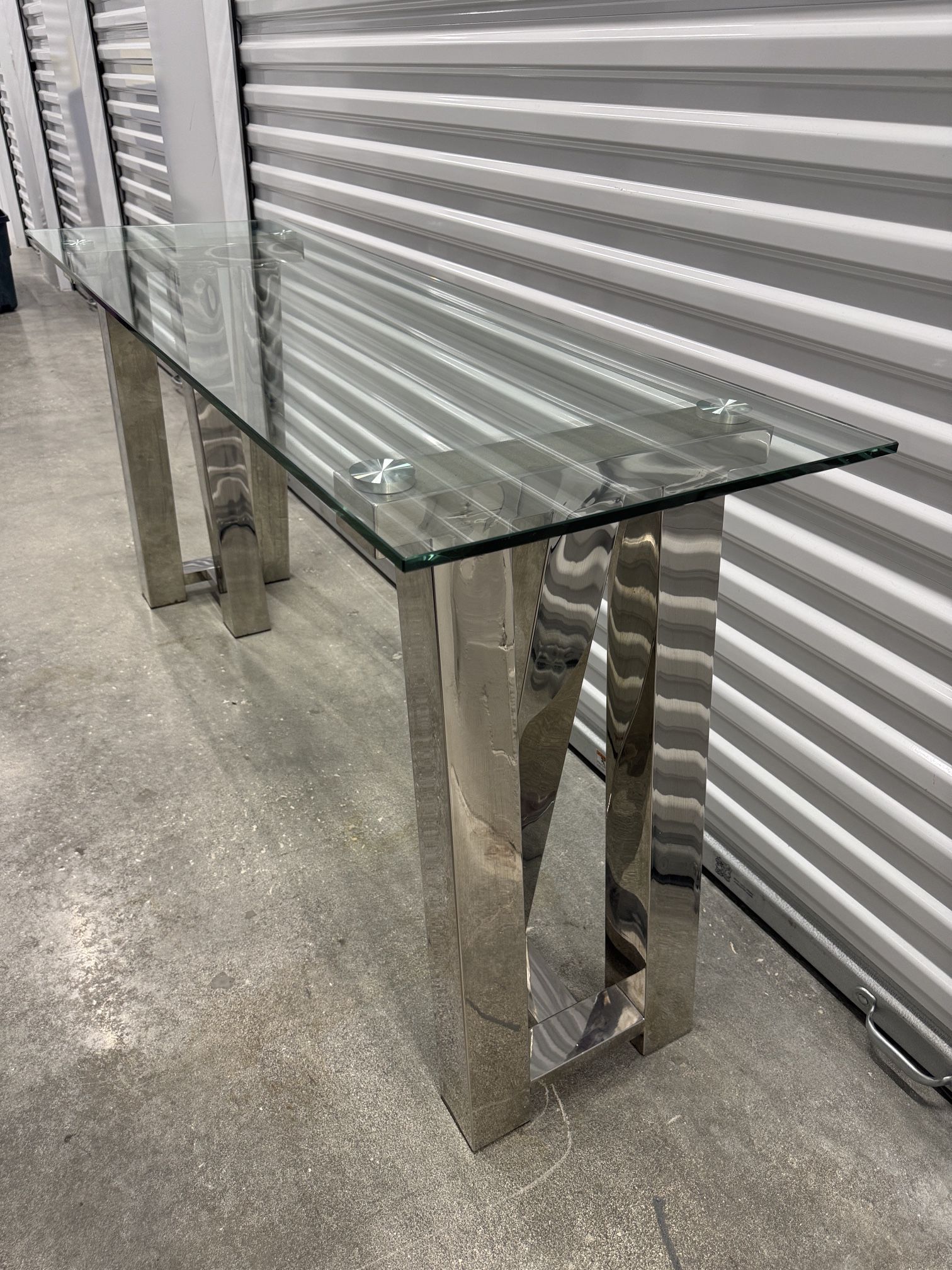 Used in good condition. π 5875 NW 163rd St Miami Lakes FL 33014 π Delivery adicional. Sleek console table with clear glass top and shiny chrome legs. Looks super modern. Great for entryway or behind sofa. Measures about 59 inches long, 19.5 inches wide, and 30 inches tall. Looks really good.