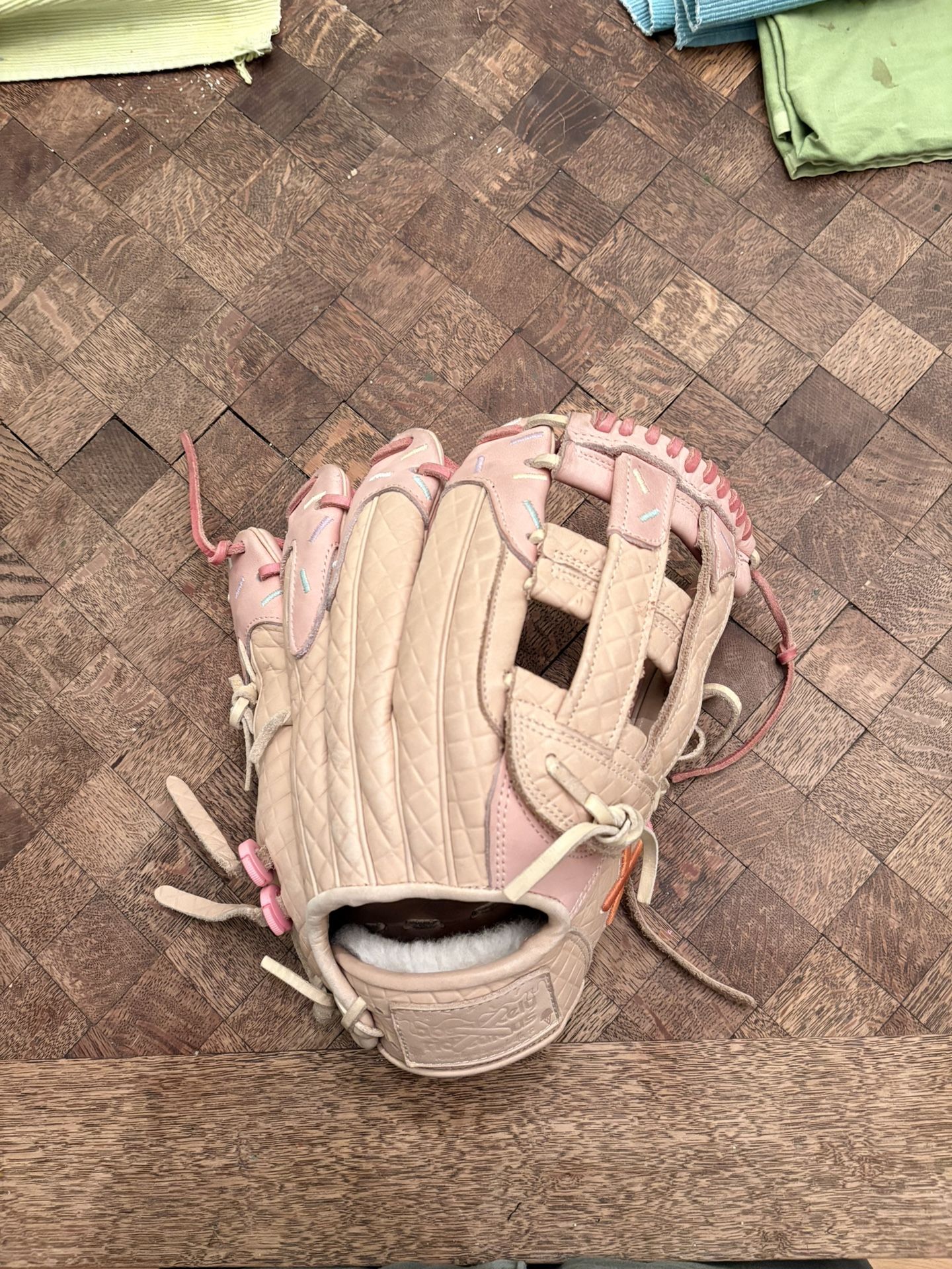 Aria right handed 12.25 H web strawberry ice cream glove This glove is broken in to perfection with less than two years of wear, bit of palm wear but otherwise flawless. Retail is roughly 400$ and it was originally custom ordered. Selling as I feel as though the glove is a bit to flashy for my taste but rather reflects my younger self. Open to trades as far as Rawlings pro preferred, or Wilson a2k of a similar size and style.