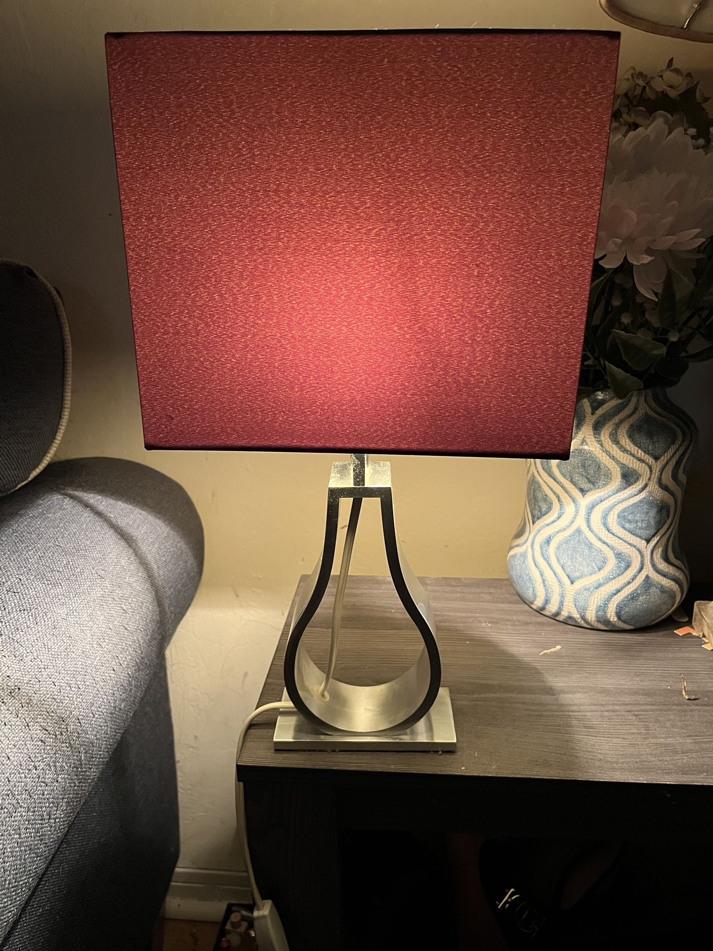 Table lamp IKEA Klabb. Purple shade, plated nickel base. Discontinued. Dimensions are width 9”, height 17” and depth 6”. Weight 1.5 lbs. Pick up only at North Gables. 35$.