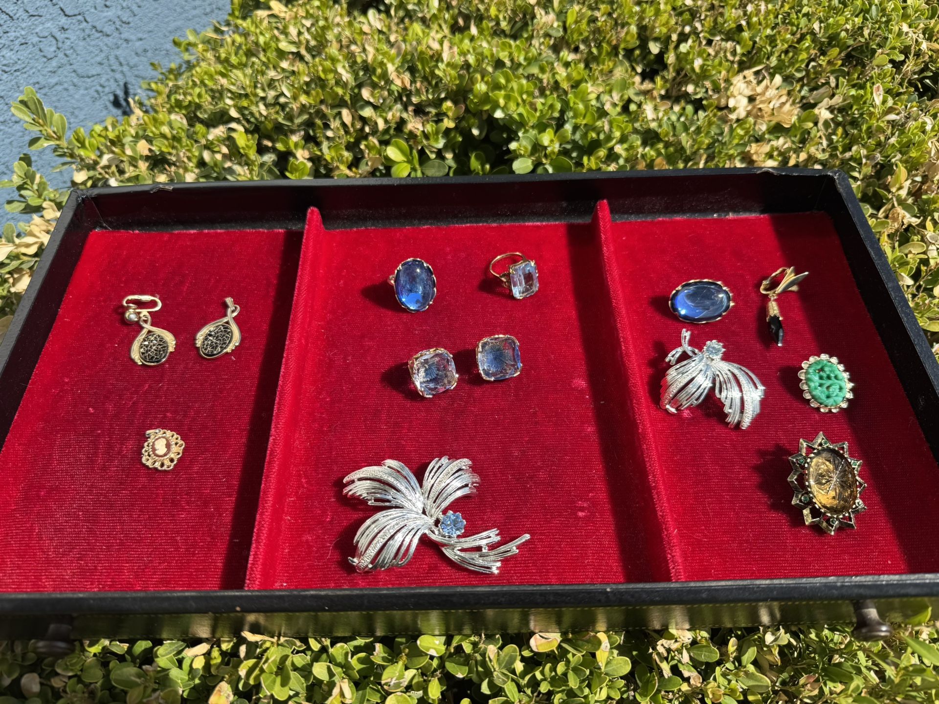 EMMONS VINTAGE COSTUME JEWELRY Emmons Rectangle aquamarine ring Emmons Square aquamarine clip-on earrings Emmons sapphire oval ring Emmons silver pin with aquamarine stone Emmons necklace pendants Emmons singleton clip-on earrings