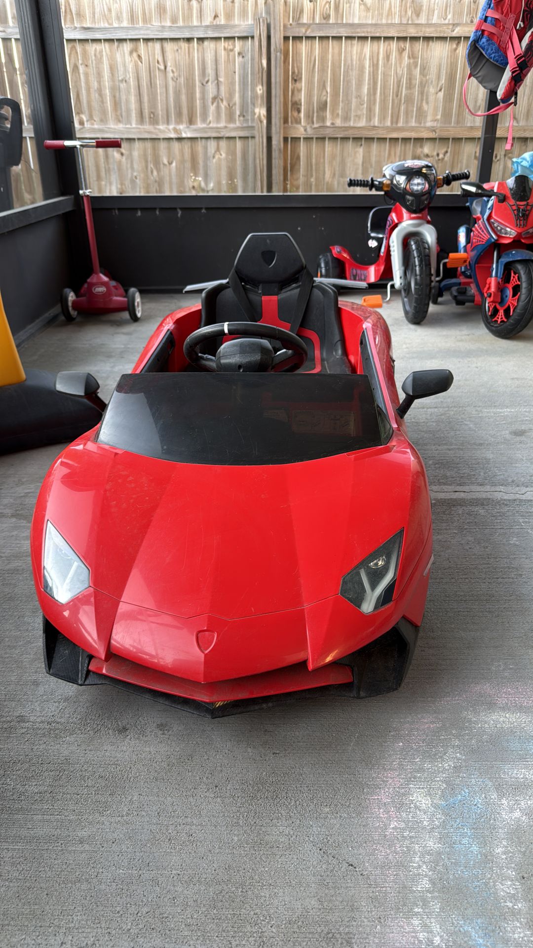 Red Lamborghini one seater Can be driven Manual or Remote Controlled Rear wheel drive Comes with charger and remote and will be cleaned before viewing Bought it for my son when he was 2 years old used it a few times then moved into a new house with a small yard he’s four now has sat ever since spends all his time in the pool now .
