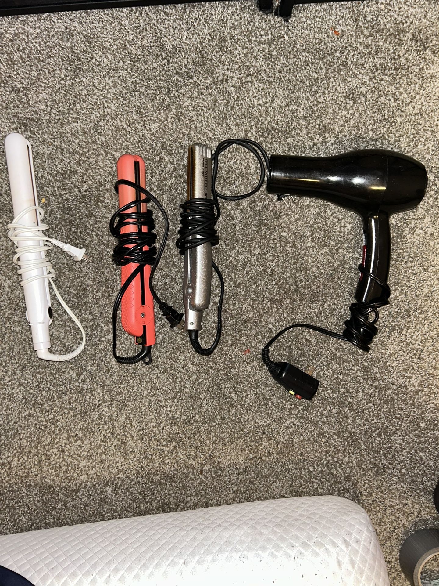Conair white flat iron -$15 Pink flat iron -$5 Paul Mitchell pro flat iron -$20 Blow dryer -$5 All products work good at just moving and have too many trying to get rid of can buy separately or if you buy together I will throw a deal message me for more Info