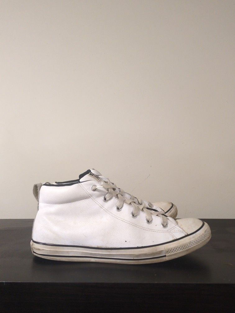 Selling a pair of classic Converse All Star mid-top sneakers in white leather. These are the Madison/High Street style, which includes extra padding around the ankle and a cushioned tongue for a more comfortable fit than standard Chucks. Material: Durable, easy-to-clean white leather upper. Design: Mid-top silhouette with a classic rubber toe cap and silver-tone eyelets. Comfort: Padded collar and tongue with a soft fabric lining. Condition: Pre-owned with some visible wear on the rubber midsole and toe cap (see photos). A quick clean will make these look even better!