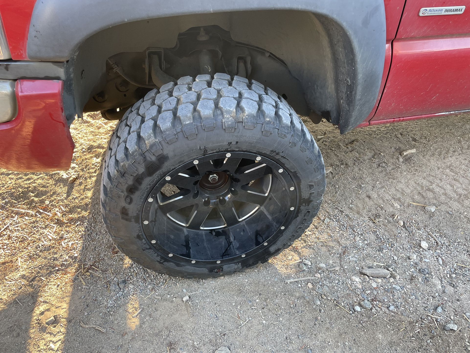 8x6.5 bolt pattern. 20x12 wheels and tires. Tires are 33x12.5 On a 2006 duramax right now . But will fit dodge on Chevy/ gmc 8 lug.