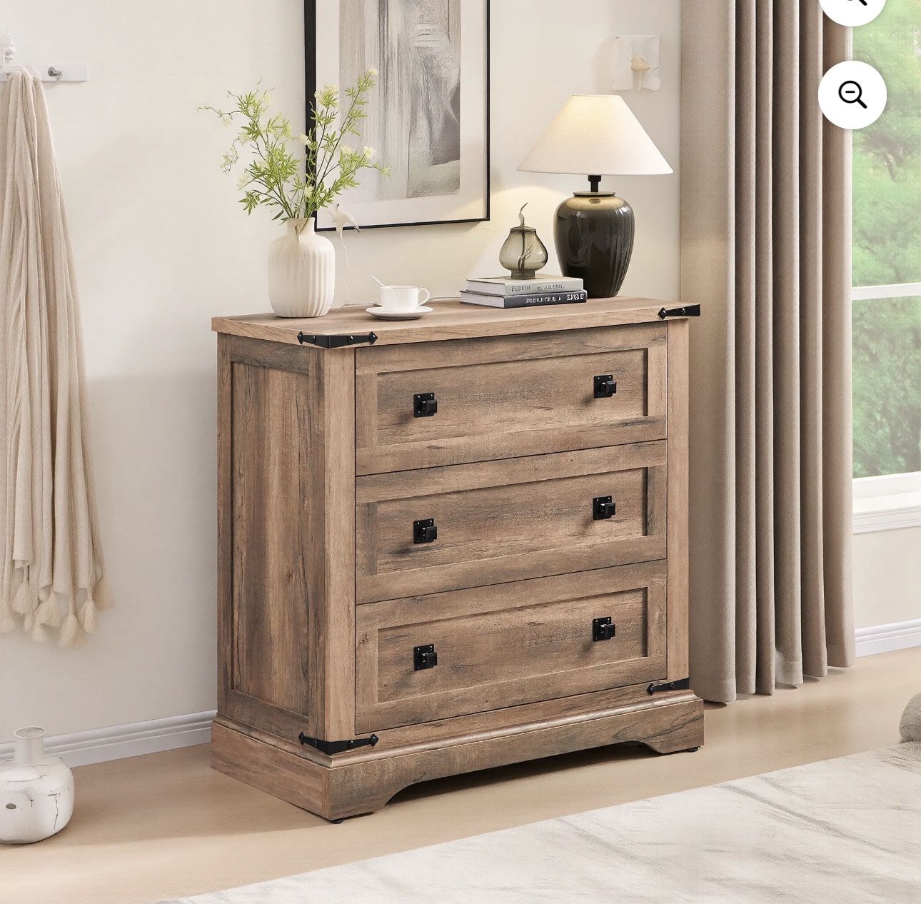 This modern farmhouse nightstand features a rustic woodgrain finish, three smooth-glide drawers, and a built-in charging station with 2 AC outlets, 1 USB port, and 1 Type -C port. Crafted from durable engineered wood with metal hardware, it offers practical storage and everyday convenience for bedrooms or living room • Modern Farmhouse Style:Designed as a modern farmhouse nightstand, this piece features a rustic woodgrain exterior with warm, natural tones. Clean lines, metal handles, and a balanced three-drawer silhouette blend farmhouse character with contemporary bedroom and living room decor • 3-Drawer Storage with Charging Station:This nightstand with charging station includes 3 smooth-glide drawers for organizing bedside essentials, books, and accessories. Built-in power access with 2 AC outlets, 1 USB port, and 1 Type-C port allows convenient charging for phones, tablets, lamps, and other daily devices • Durable Engineered Wood Construction:Crafted from FSC-certified wood, reinforced MDF, and P2 engineered wood, this wooden nightstand features a waterproof surface and sturdy metal hardware for long-term durability and easy daily maintenance • Versatile End Table Use:Functioning as a bedside table for bedroom or a living room end table, this versatile three-drawer design offers practical storage and surface space for a variety of home settings, making it suitable for bedrooms, apartments, or guest rooms Pickup only! ✅ ALL SALES FINAL