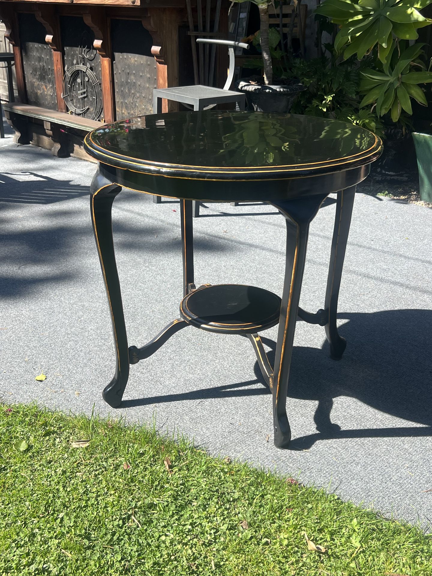 $175 obo Description Elegant vintage black lacquer accent table with hand-painted gold trim detailing. This piece features a classic round top with gracefully curved legs and a lower circular display shelf, giving it both style and function. Perfect as a side table, entryway table, small breakfast table, or decorative accent piece. The glossy black finish with gold edging gives it a timeless look that works beautifully with traditional, Hollywood Regency, or eclectic interiors. The lower shelf is great for books, plants, or decorative items. The table is solid, sturdy, and ready to use. Dimensions • Diameter: 30 inches • Height: 30 inches Condition Very good vintage condition with light wear consistent with age. Pick up is by the Grove/Weho area. Holds accepted with Venmo only. Serious buyers only please! First come first served. Keep an eye out for periodic price markdowns! Delivery available.