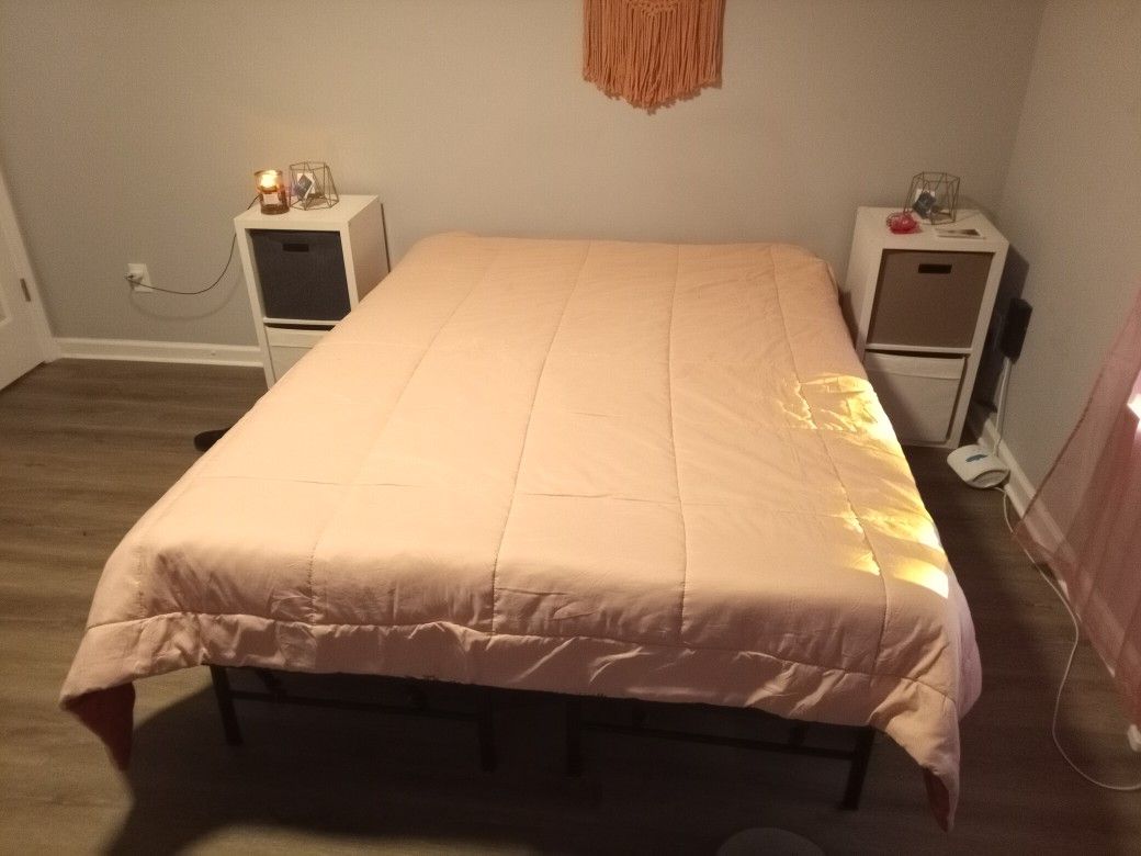 Queen serta mattress platform bed frame 2 nightstands & Wall decor all from hobby lobby