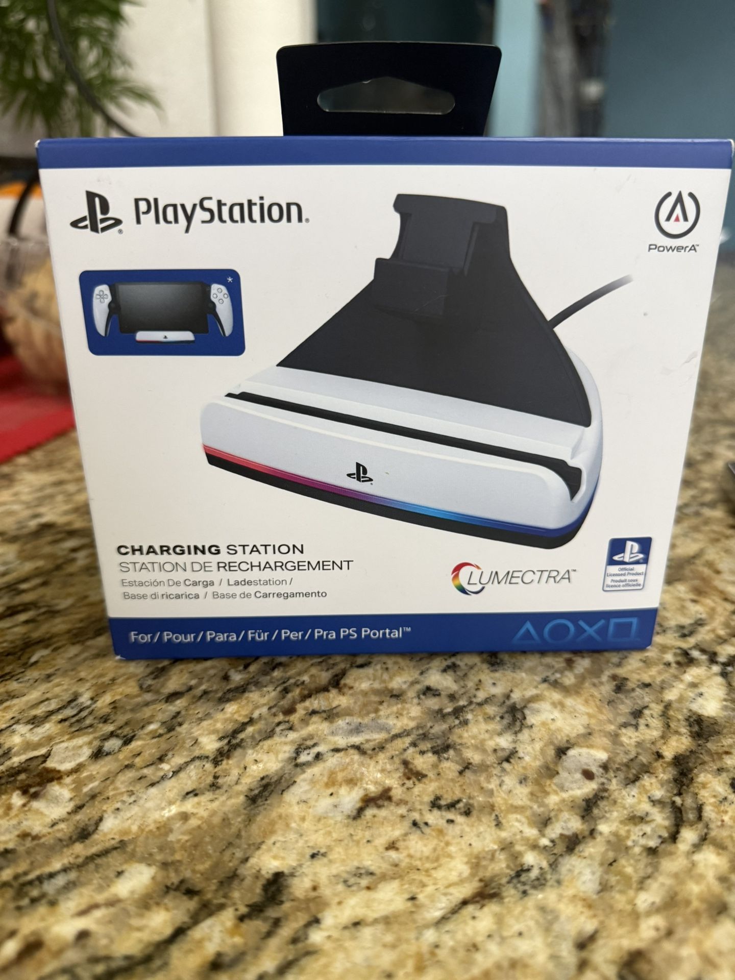 Never opened and includes: -charging station -5ft USB C cable -USB C Charging Adapter -User Manual