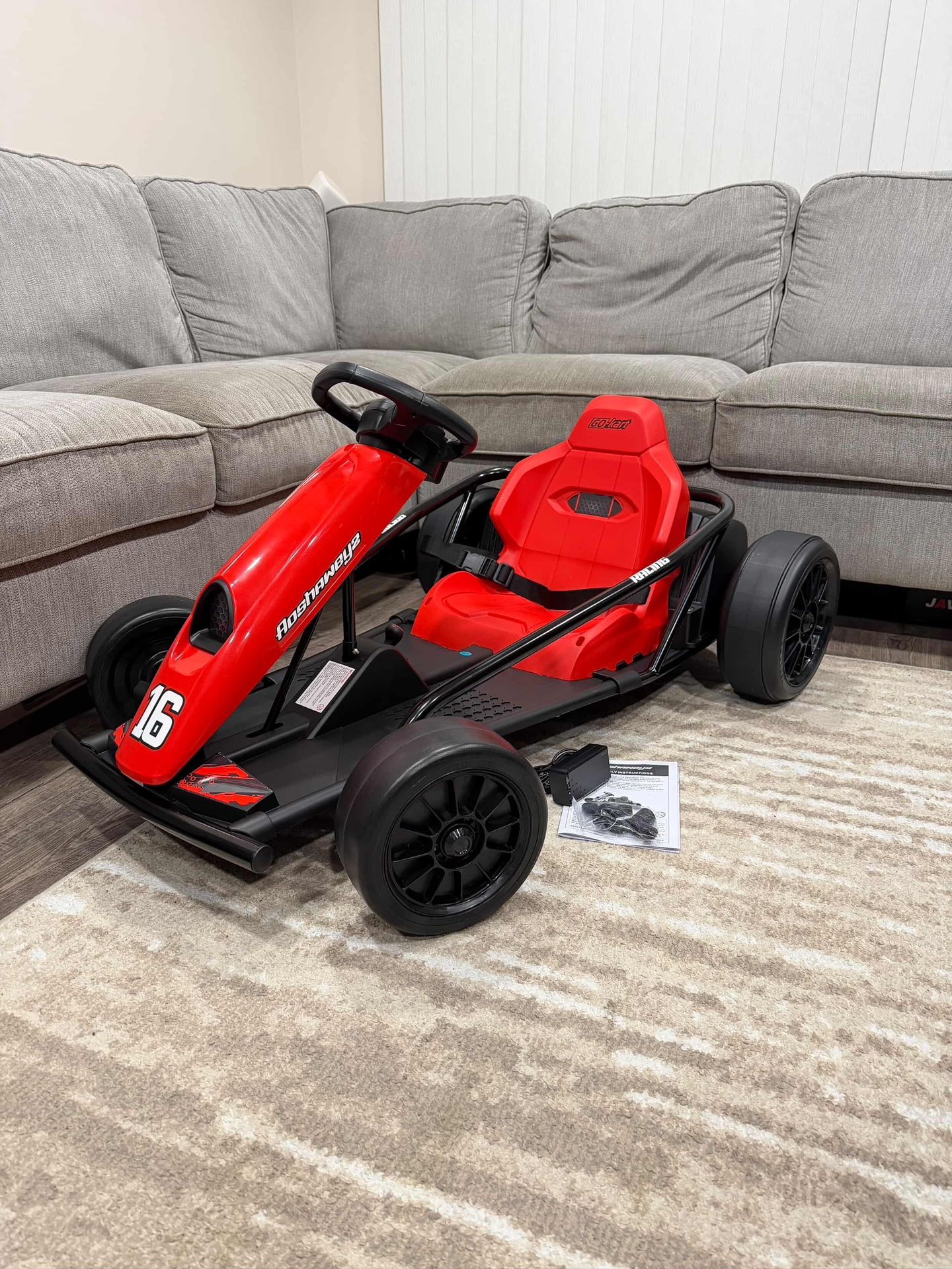 New Electric Go Kart for Kids up to 13 years old. Comes with charger and accessories. Has different speed modes.