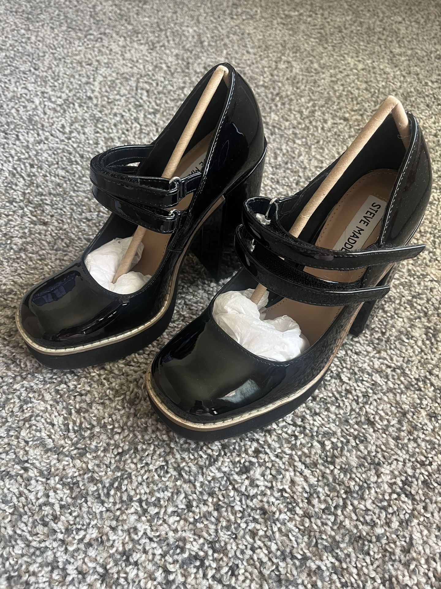a chunky block heel and front small platform with delicate straps in a dressy look. Block heel platform dress heel shoe Crossed delicate straps with buckle closure Block heel with front platform Synthetic upper material Synthetic lining Synthetic sock Synthetic sole Imported
