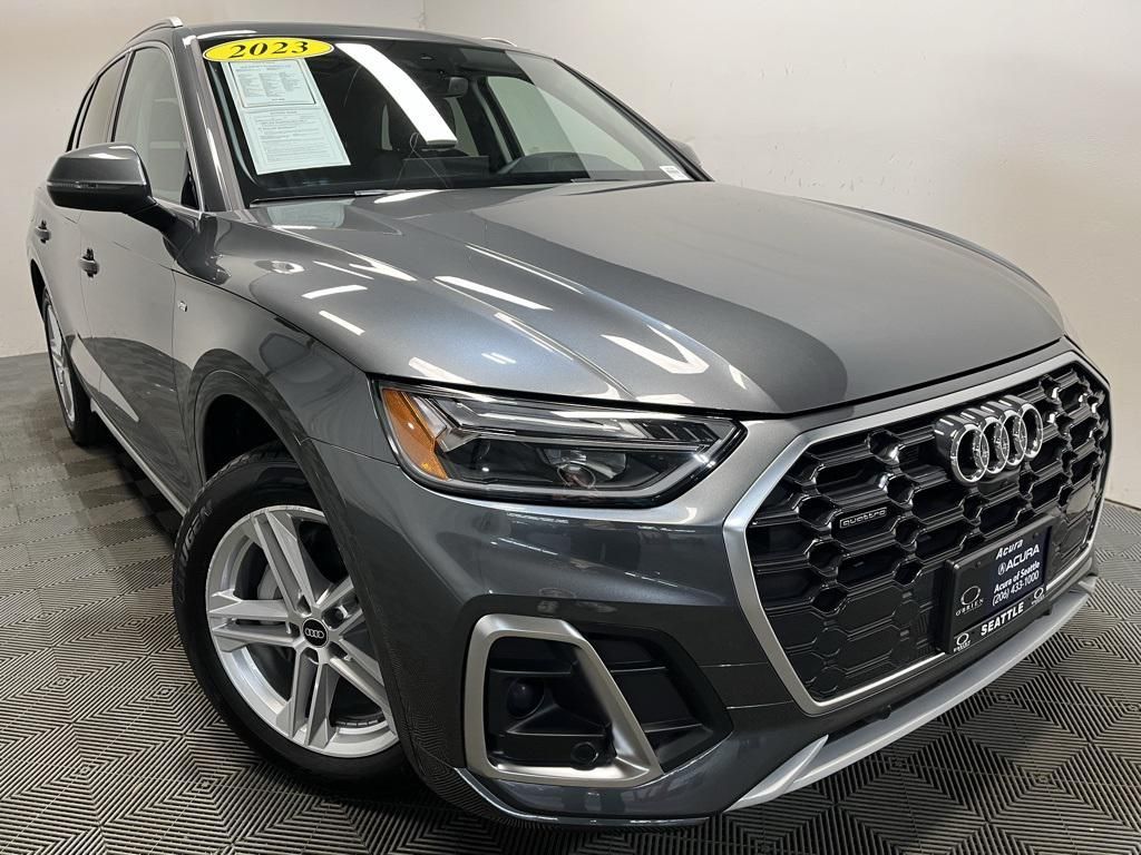 2023 Audi Q5 e 55 Premium S Line Daytona Gray Pearl quattro 2.0L Turbocharged 7-Speed Automatic S tronicQ5 e 55 Premium S Line, Audi Active Lane Assist, Audi Advanced Key, Auto-Dimming Heated & Pwr Folding Exterior Mirrors, Bang & Olufsen Sound System w/3D Sound, Convenience Package, Deluxe Pre-Entry Climate Control, Driver Seat Memory, Hands-On Detection Steering Wheel, Heated Steering Wheel, Panoramic Sunroof, Power Adjustable Steering Column, Premium Plus Package, SiriusXM w/360L, Top View Camera System, Traffic Jam Assist, 10 Speakers, 4-Wheel Disc Brakes, ABS brakes, Air Conditioning, Alloy wheels, AM/FM radio, Audi Beam-Rings, Audi Guard All-Weather Floor Mats (Set of 4), Auto High-beam Headlights, Auto-dimming Rear-View mirror, Automatic temperature control, Axle Ratio: 5.30, Brake assist, Bumpers: body-color, Compass, Delay-off headlights, Driver door bin, Driver vanity mirror, Dual front impact airbags, Dual front side impact airbags, Electric Powered Steering Column Delete (DISC), Electronic Stability Control, Emergency communication system: Audi connect CARE, Exterior Parking Camera Rear, Four wheel independent suspension, Front anti-roll bar, Front Bucket Seats, Front Center Armrest, Front dual zone A/C, Front fog lights, Front reading lights, Garage door transmitter: HomeLink, Genuine wood console insert, Genuine wood dashboard insert, Genuine wood door panel insert, Gray-Brown Birch Natural Wood Inlays, Heated 8-Way Power Front Seats, Heated door mirrors, Heated front seats, Illuminated entry, Integrated Toll Module Delete (DISC), Leather Seating Surfaces, Leather Shift Knob, Low tire pressure warning, Occupant sensing airbag, Outside temperature display, Overhead airbag, Overhead console, Panic alarm, Passenger door bin, Passenger vanity mirror, Power door mirrors, Power driver seat, Power Liftgate, Power passenger seat, Power steering, Power windows, Privacy Trunk Cover, Radio data system, Radio: Audi Sound System, Rain sensing wipers, Rear air conditioning, Rear anti-roll bar, Rear fog lights, Rear reading lights, Rear seat center armrest, Rear window defroster, Rear window wiper, Remote keyless entry, Roof rack, Security system, Speed control, Speed-sensing steering, Speed-Sensitive Wipers, Split folding rear seat, Spoiler, Steering wheel mounted audio controls, Tachometer, Telescoping steering wheel, Tilt steering wheel, Traction control, Trailer Hitch, Trip computer, Turn signal indicator mirrors, Variably intermittent wipers, Wheels: 19"" 5-Double-Spoke-Star Design, Q5 e 55 Premium S Line, Audi Active Lane Assist, Audi Advanced Key, Auto-Dimming Heated & Pwr Folding Exterior Mirrors, Bang & Olufsen Sound System w/3D Sound, Convenience Package, Deluxe Pre-Entry Climate Control, Driver Seat Memory, Hands-On Detection Steering Wheel, Heated Steering Wheel, Panoramic Sunroof, Power Adjustable Steering Column, Premium Plus Package, SiriusXM w/360L, Top View Camera System, Traffic Jam Assist.CARFAX One-Owner. Clean CARFAX.Priced below KBB Fair Purchase Price! Odometer is 8511 miles below market average!Come to www.acuraofseattle.com to See Our Specials and Call 206-433-1000 for help with any of our Pre-Owned and Luxury Pre-Owned Cars. See us on our Facebook Page!! Acura of Seattle was Washington's First Acura Dealer and is Still the Best!! We have a 4.7 score on Dealer Rater, a 4.7 Rating on Sure Critic, a 4.5 Rating on Google and a 4.5 on Facebook!! You KNOW we make people happy to get THOSE scores!!!