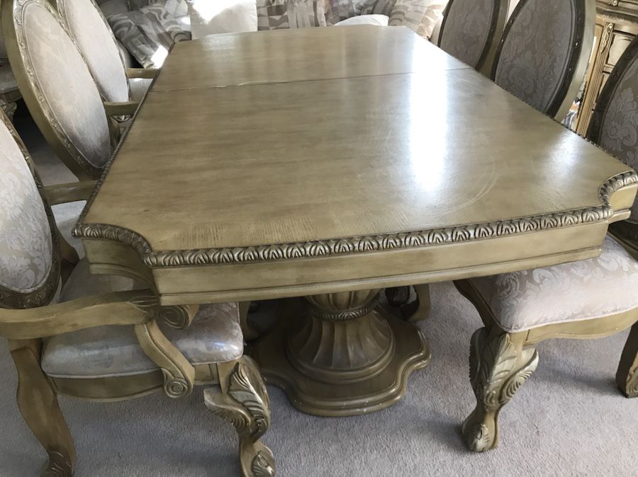 Dining room table with 2 extensions and 8 chairs. Brand is Aico. Model is La Francaise
