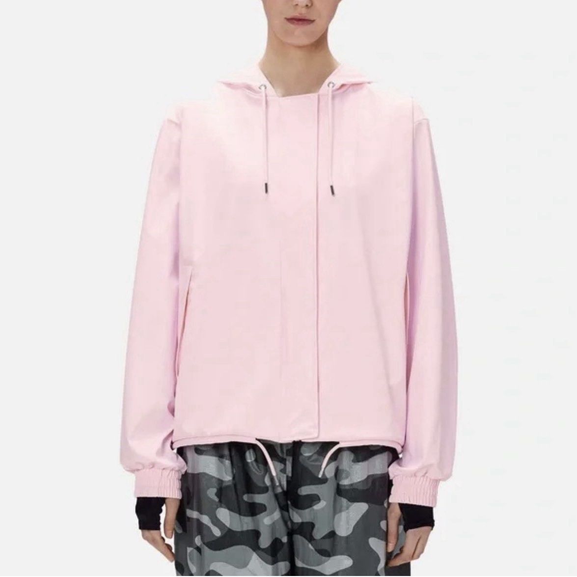 RAINS Waterproof Rain Jacket String W Jacket W3 Color Candy - soft pink shade New with tags Never been used or worn Size Medium Waterproof Protection: Rated W3, it is designed to provide waterproof protection from light rain and can withstand a 5000 mm water column pressure. Material: Crafted from RAINS' signature lightweight PU fabric (100% polyester with a polyurethane coating) with double-welded seams to keep water out. Design Details: Includes a drawstring hood with a built-in cap brim, a snap-fastened placket, double-welded front pockets, and a drawstring hem to alter the silhouette. Breathability: Features under-arm eyelets for ventilation.