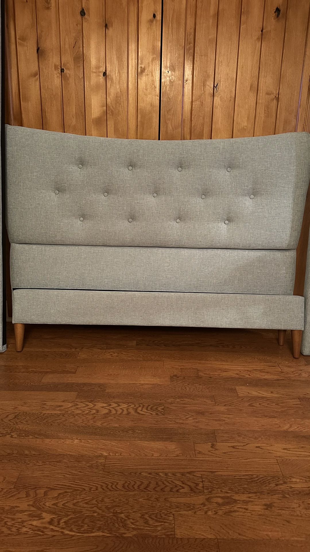 Like new queen bed, upholstered in color blue. Comes with slats, no box spring needed. Was in guest room, rarely used.