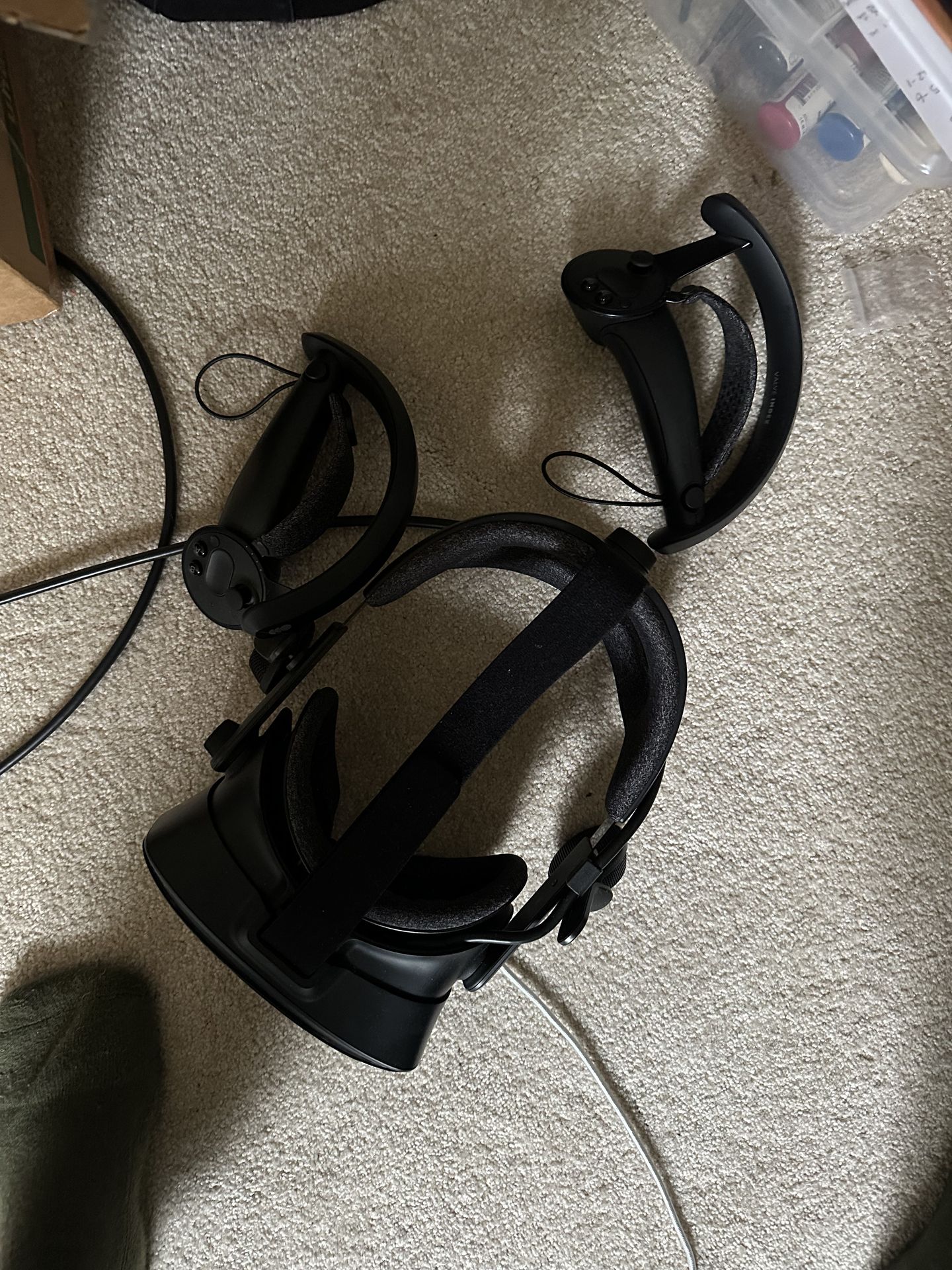 Comes with: - Both controllers, NO charging cables (usb-c) - One base station 2.0* with cables - Headset with cables *A friend of mine was borrowing the headset long term from me, and in November she had to RMA one of the base stations. She emailed them again about 2 weeks ago but hasn’t heard back yet. The headset is perfectly usable in most games with just one if you’re sitting down and it can see the headset, because most games have joystick turning. If you’d like, I can give you the second base station for free when I get it, though I’m not quite certain when Valve will get back to my friend.