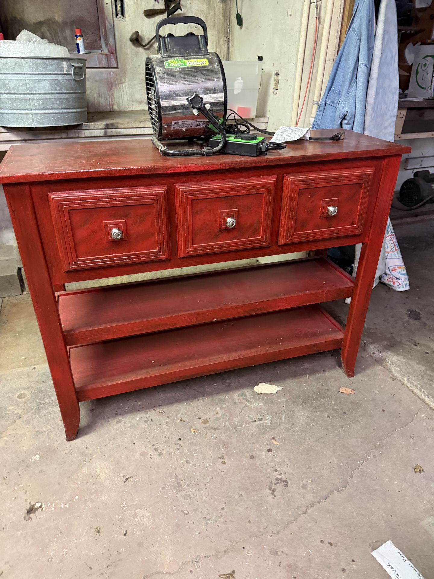 Wooden red beautiful decor table! Measures approximately 45.9 inches wide, 15 inches deep, and 34.1 inches hig