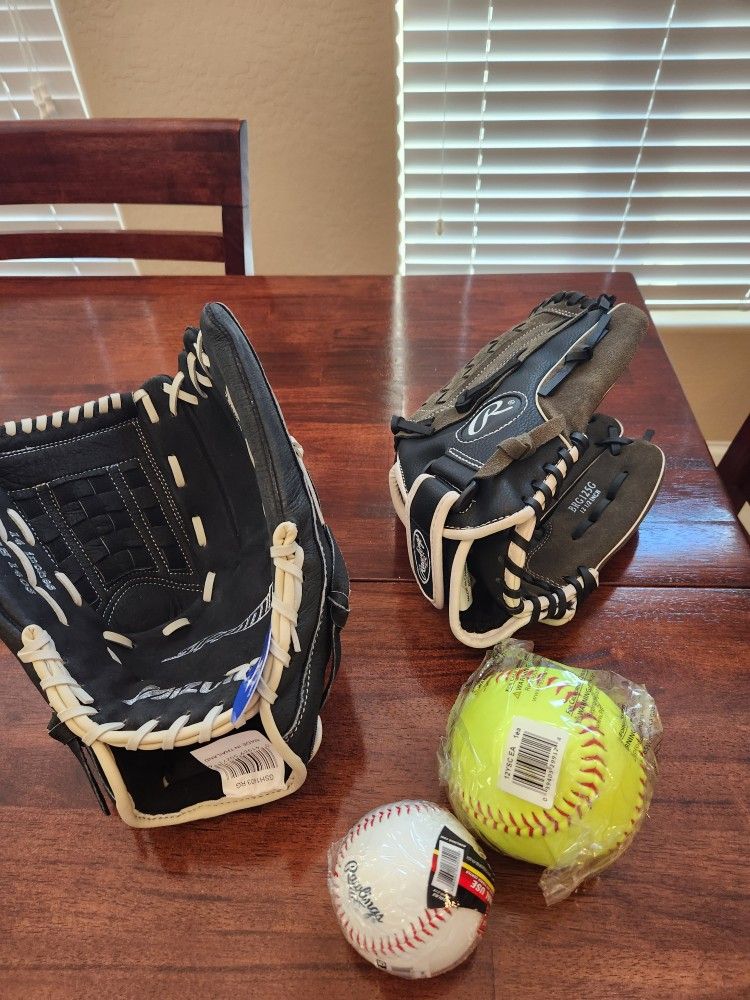 New: professional grade Rawlings & Mizuno gloves. Black leather, with tags on, comes with one wrapped florescent softball and one wrapped Rawlings baseball.