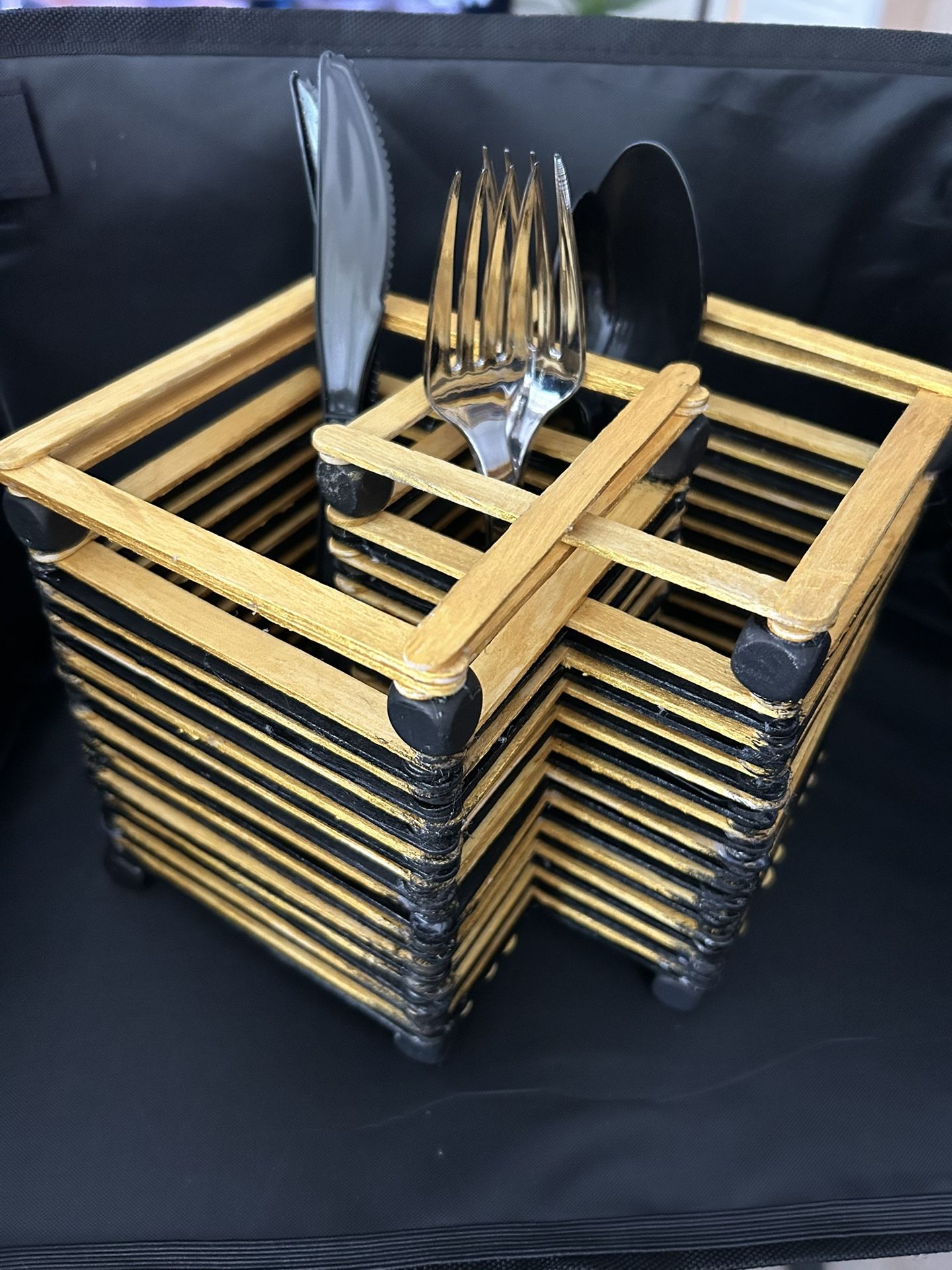 Silverware holder made w/ Gold & black popsicle sticks. 9 in. Length- about 5 1/2 to 6 in. In height Hold knives, forks, spoons & napkins. Can also be used for pen& pencil, cellphone