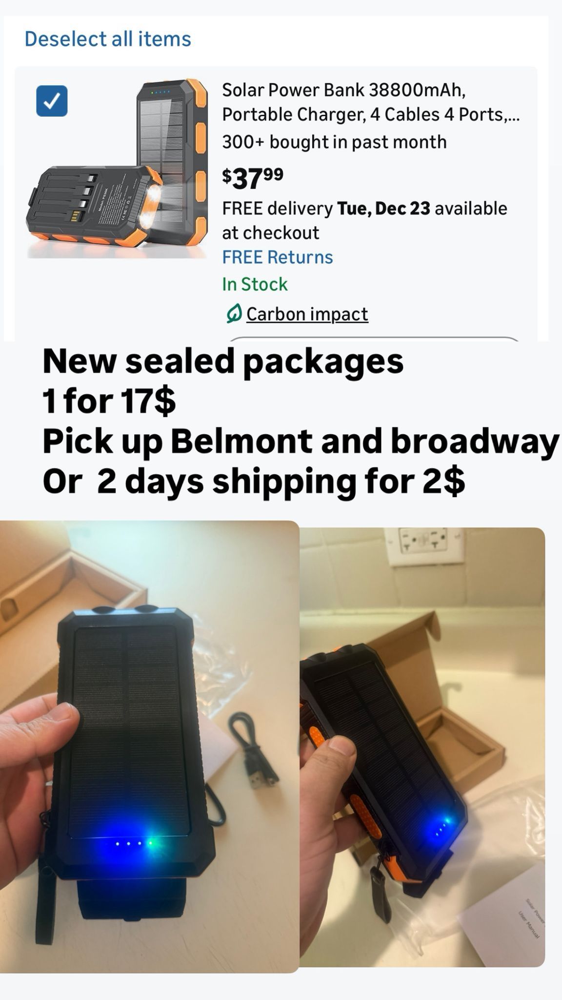 Solar Power Bank 38800mAh, Portable Charger, 4 Cables 4 Ports, PD22.5W Fast Charging External Battery Pack with USB C for Cell Phones, Solar Charger with Dual Flashlight, Perfect for Camping Travel New sealed packages Pick up Belmont and broadway Chicago 2 days shipping for 2$ Any lower offers will be ignored Item is more than 50% off Amazon . 3 lights modes Dust / water / drop proof 1000 cycle life span
