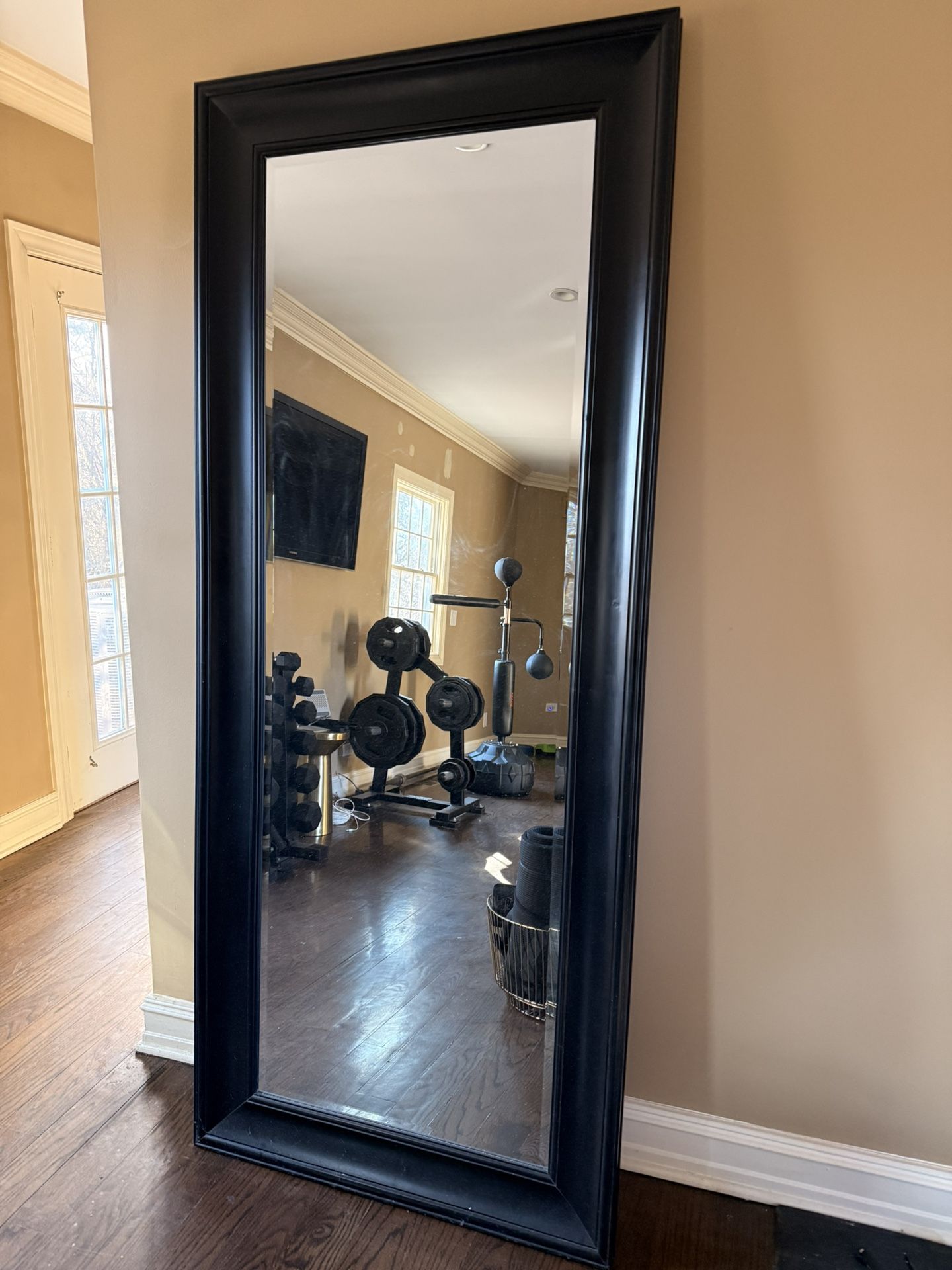 Large Black Framed Full-Length Leaning Mirror - 79.5” x 33.5” - Good Condition - $80 Firm - North Shore Chicago Pickup Only For sale: Tall black framed full-length mirror in good used condition. Measures approximately 79.5 inches tall x 33.5 inches wide (about 6’8” x 2’9”). Sturdy, heavy framed design, ideal for a bedroom, entryway, home gym, or workout space to check form and progress. Leaning/floor-style mirror (leans securely against the wall; can be mounted if you prefer). Clean, clear reflective surface, no cracks, chips, or major scratches on the glass. Solid black molded frame shows normal light wear from use (minor scuffs typical for a used item), but overall very nice and fully functional. From a smoke-free home in the North Shore Chicago area. Local pickup only (North Shore suburbs, no shipping, no delivery, no exceptions). Cash or Zelle accepted only at pickup. Message me with your availability to view and pick up. First come, first served.