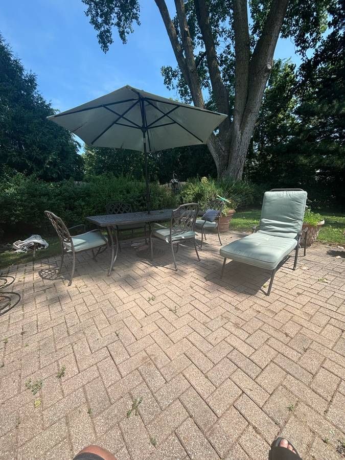 Patio furniture includes table 4 chairs, Chaise lounge chair I’ll come with cushions made of an alloy material that won’t rust and can be left out year-round Currently in storage in Buffalo Grove