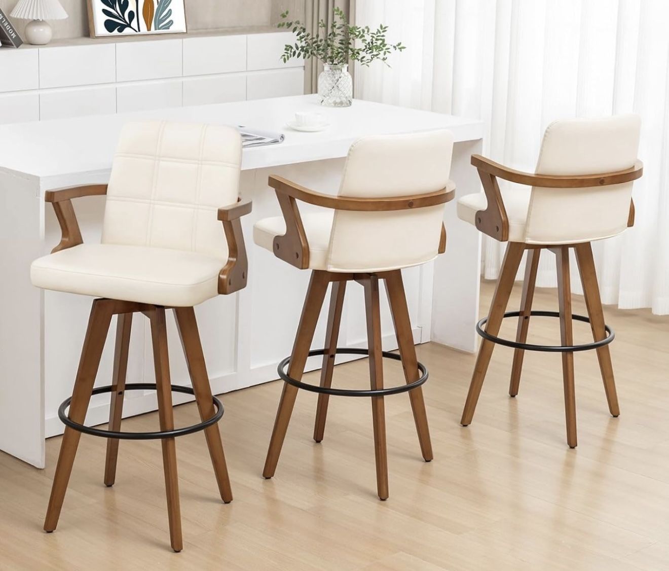 Swivel Bar Stools Set of 3 - 30 inch Mid Century Bar Stools with Curved Back and Arms, Walnut Craftsmanship, Faux Leather Seat, Kitchen Island Stools