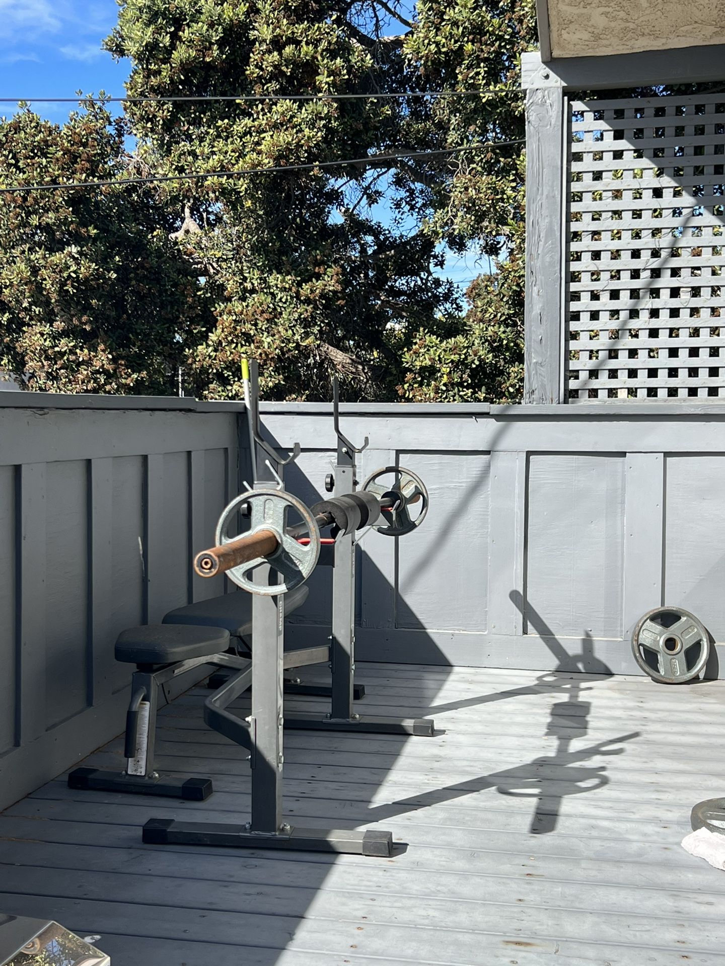 Bench press Olympic bar 45 lbs Rack Bench Could also be used as a squat press rack Comes with 4 25 lb weights and 2 10 lb weights
