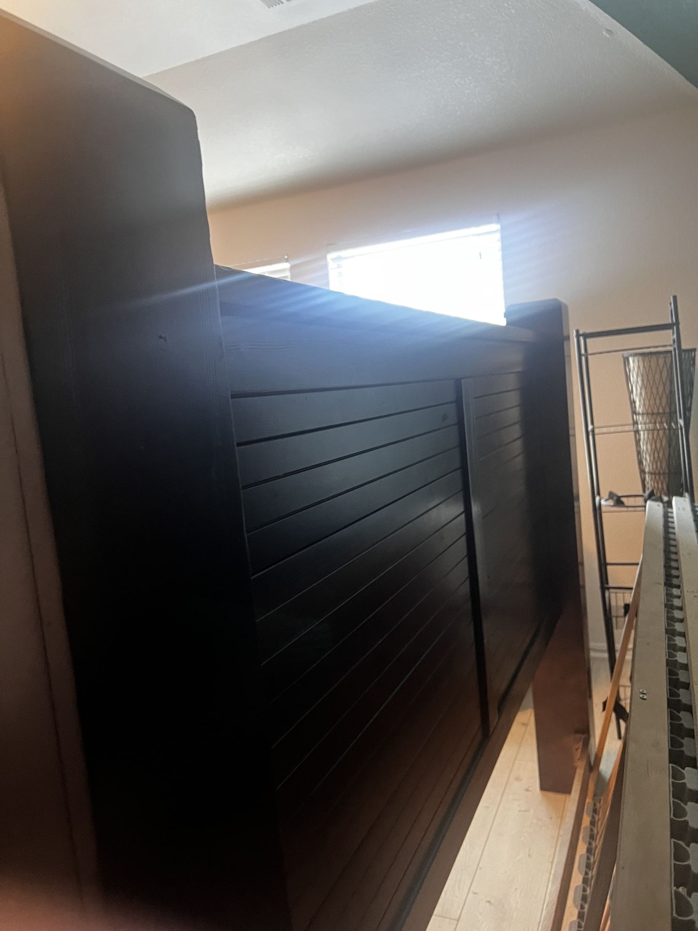 Purchased at Nebraska Furniture Mart a few years ago but it’s too big for our current room. It has some scuffs on one side from our last move (last picture). It’s wood so it can be lightly sanded and cleaned up. We replaced the bottom with IKEA slats to make it a platform bed (included) so no box springs are needed.