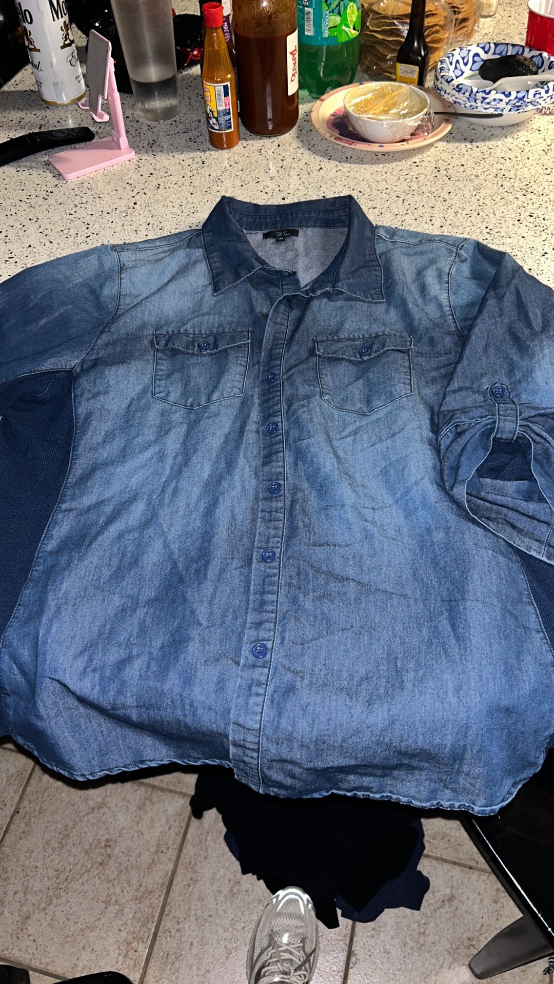 Es azul estilo mezclilla delgada está seminueva manga 3/4 estilo baquera podría de ir q es Xxl en realidad la talla dice 3x pero creo q es 2x es estimable cómoda disponible en Buena Park aceptó Zelle