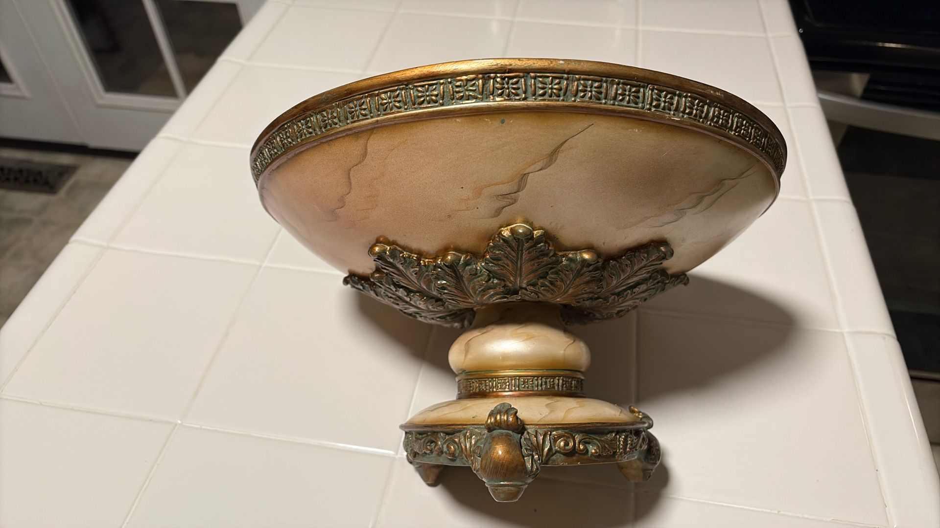 I used this item to hold various things as a centerpiece in my dining room. Can be used with fruit, float candles, Christmas decorations, etc. looks like marble, but I believe it is resin. Weighs a little over 6 lbs. In good condition, a few tiny scratches, but still looks good. Porch pick up only.